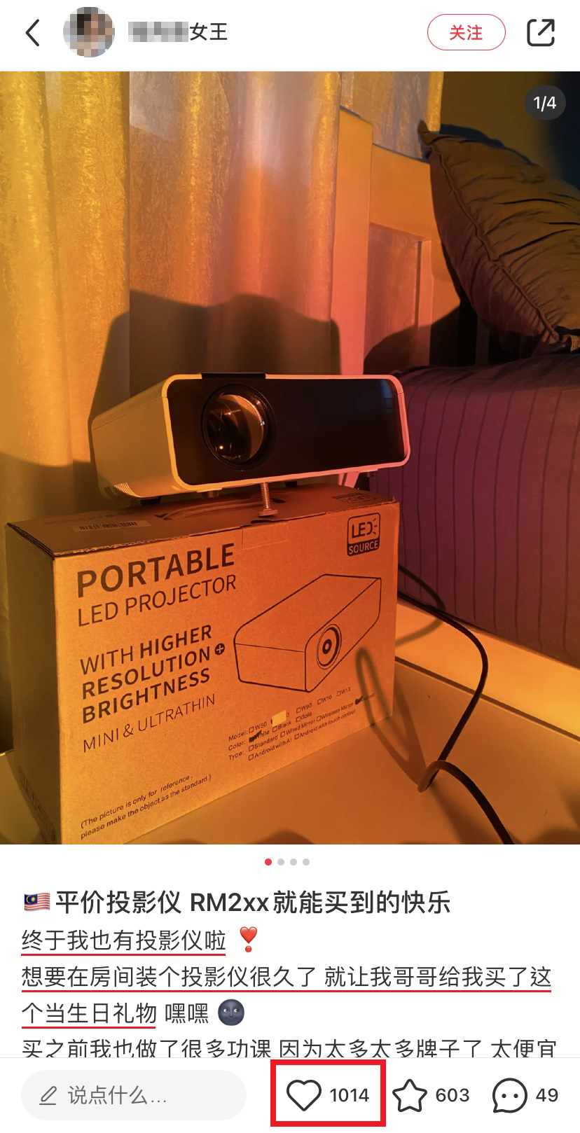 一名大马女生近日在小红书“安利”一款她刚入手的平价投影仪,只需RM200多性价比却出乎意料的高!