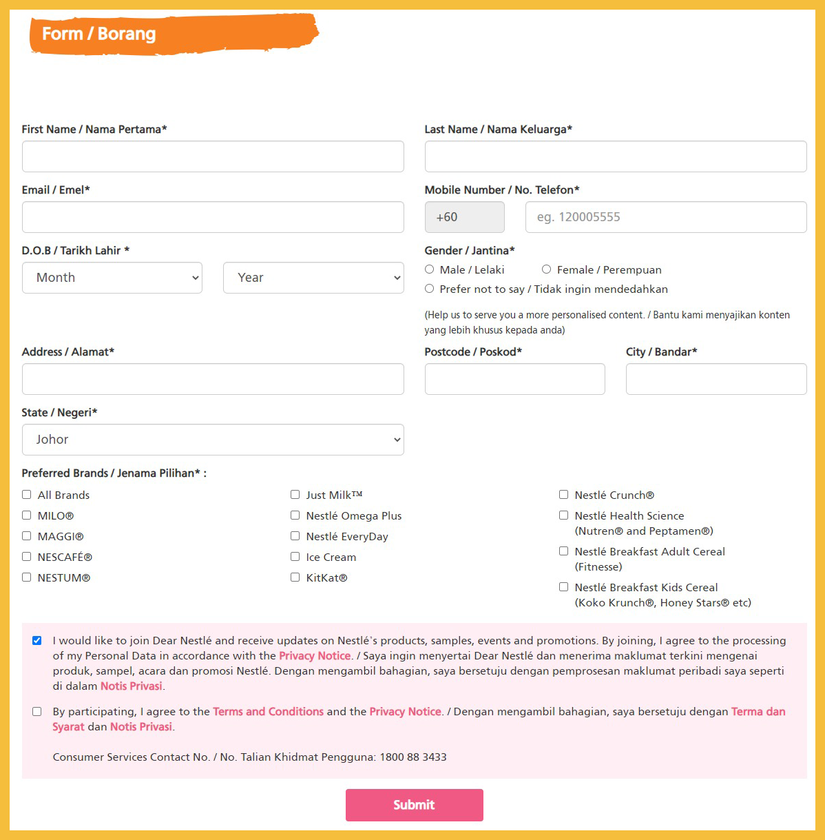 步骤1:浏览Dear Nestle 官网【点击这里】,输入你的资料后,点击“Submit”。