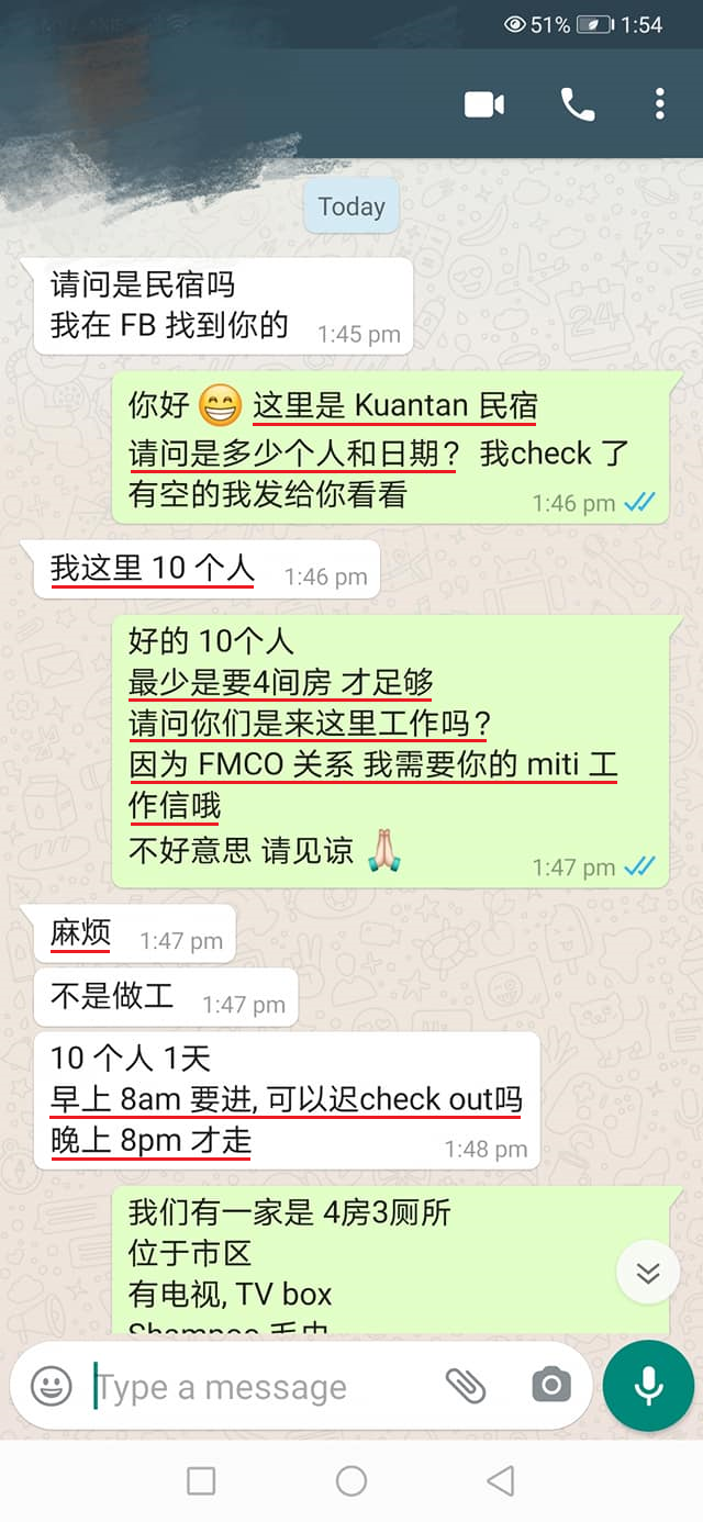 对方用 WhatsApp 联系位于 Kuantan 的民宿,并告知共有10个人要入住。客服提醒由于现在还在行管令期间,所以需要 MITI 批准信才能办入住,结果对方回复一句:「麻烦!不是做工。」而且还要求“早进迟出”。