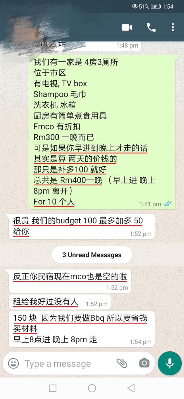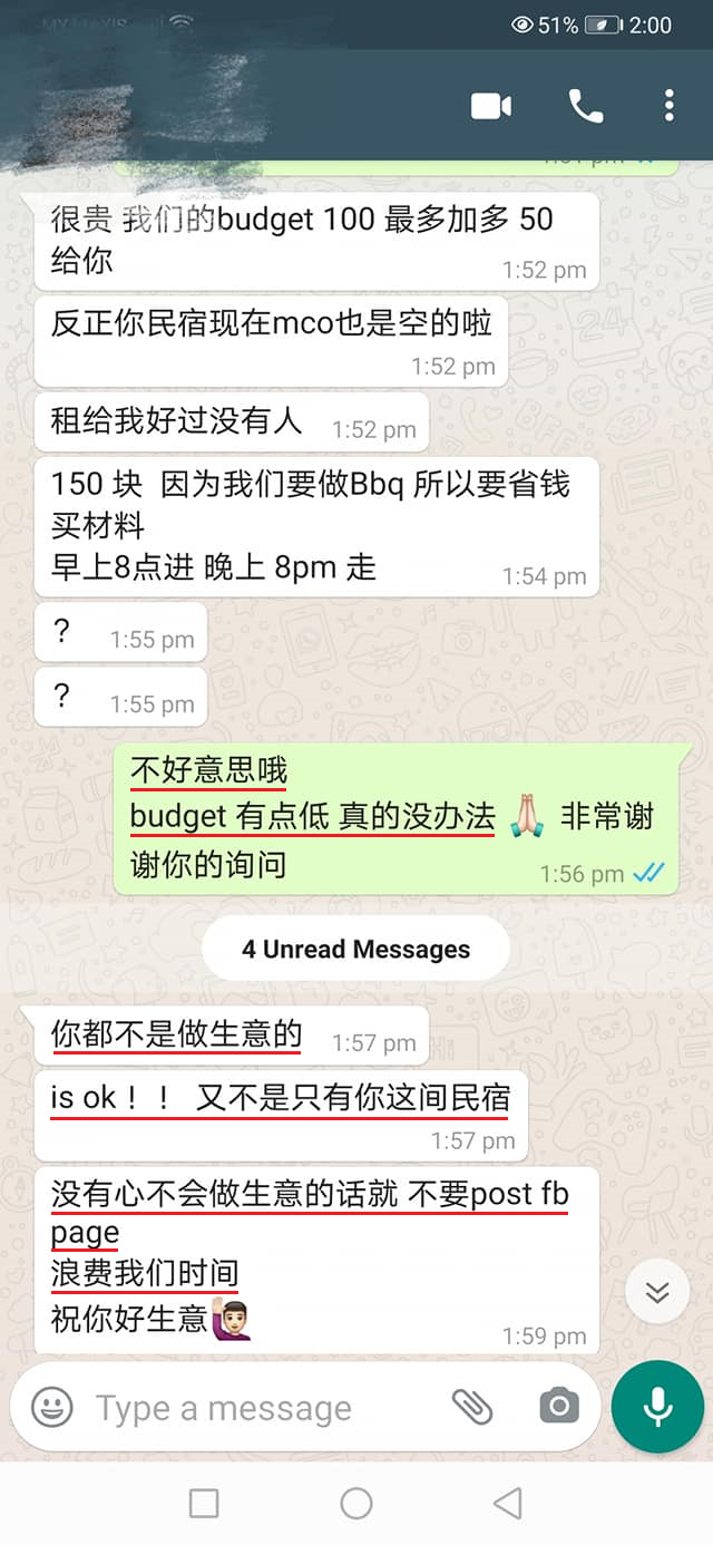 民宿客服回复了价格以后,对方表示太贵,他们的预算只有RM100至RM150,原因是:「因为我们要做BBQ,所以要省钱买材料。」