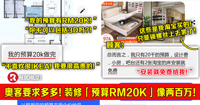 大马奥客要求多多「要免费要很高贵」!装修预算RM20,000像两百万!