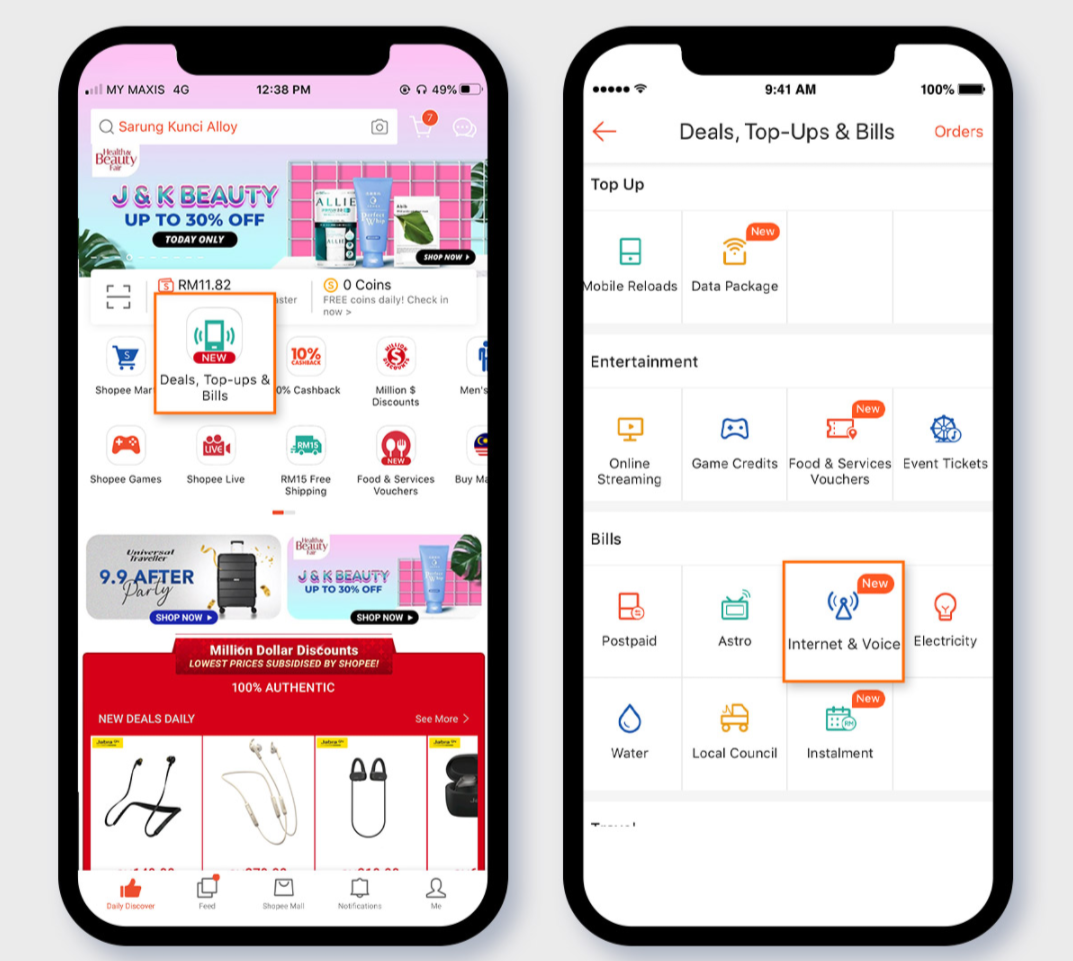 步骤1:打开你的Shopee App,点击「Deals, Top-Up & Bills」,点击「Internet & Voice」。