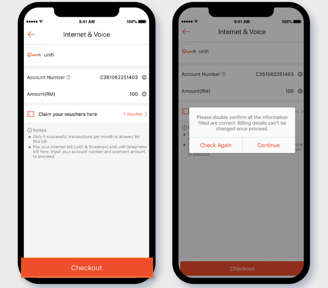 步骤4:选择「Checkout」,检查你所输入的Unifi 账号和数额是否正确。然后,点击「Continue」。