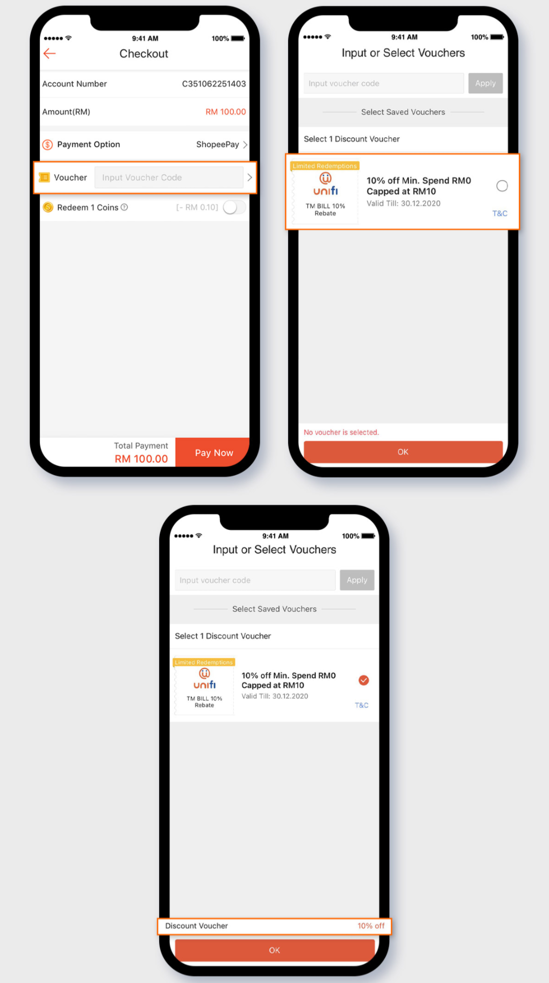 步骤6:点击「Input Voucher Code」,选择Unifi 折扣10%优惠券,点击「OK」!