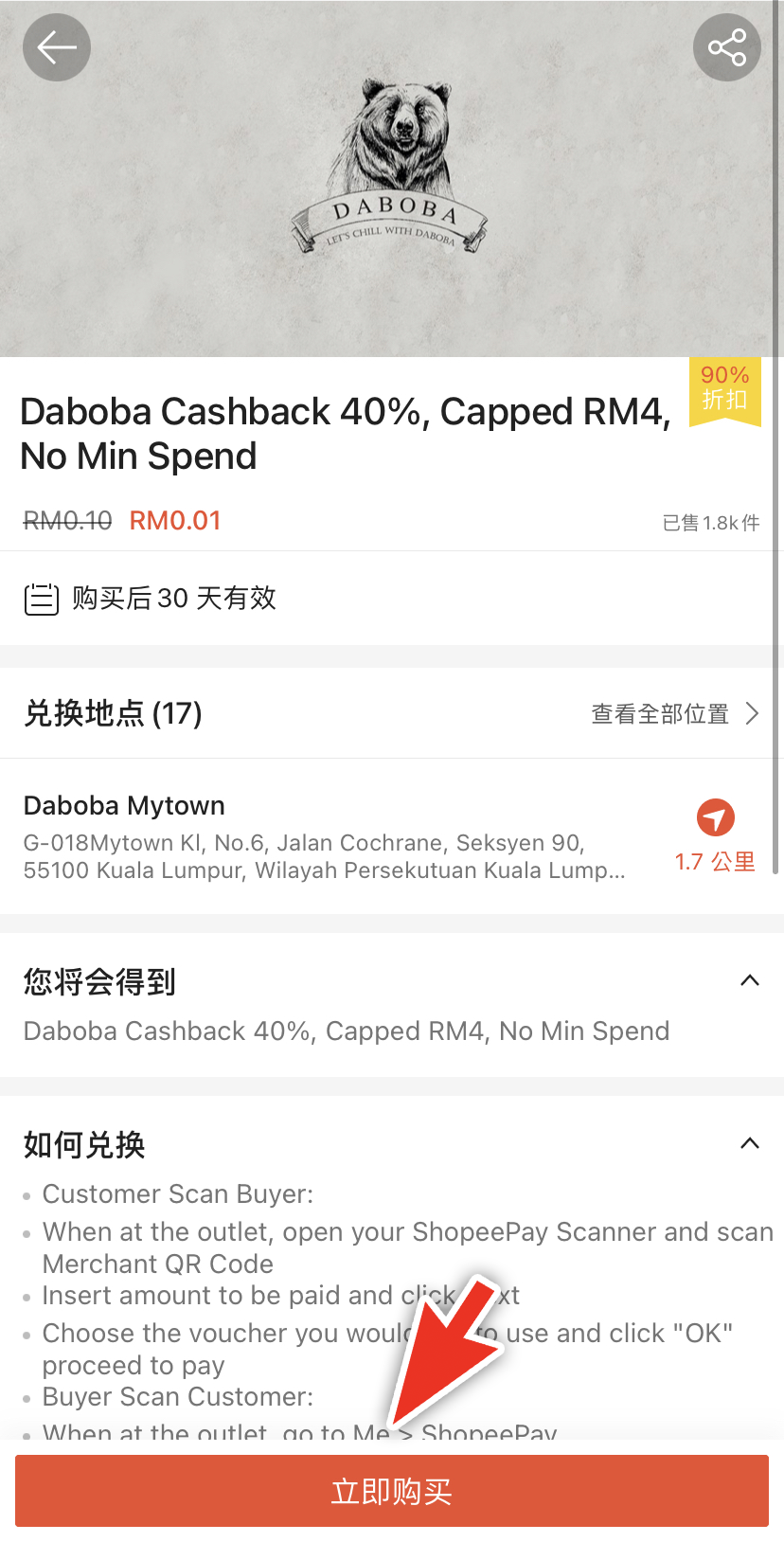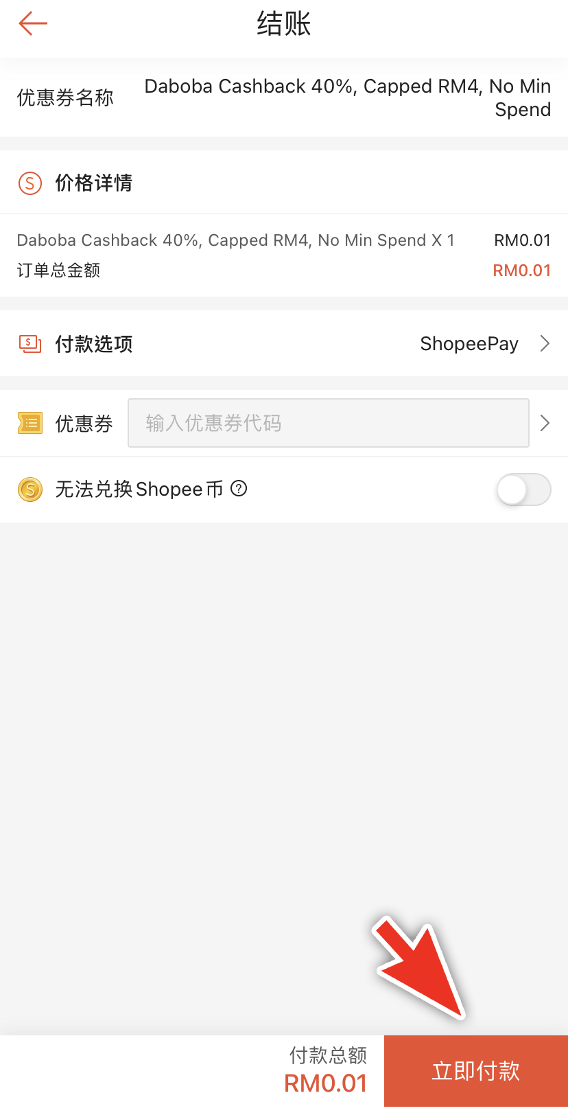▼ Step 3:最后点击“立即付款”并完成付款程序。亲临商店要兑换折扣券的时候,记得使用 ShopeePay 付款并使用该券哦!