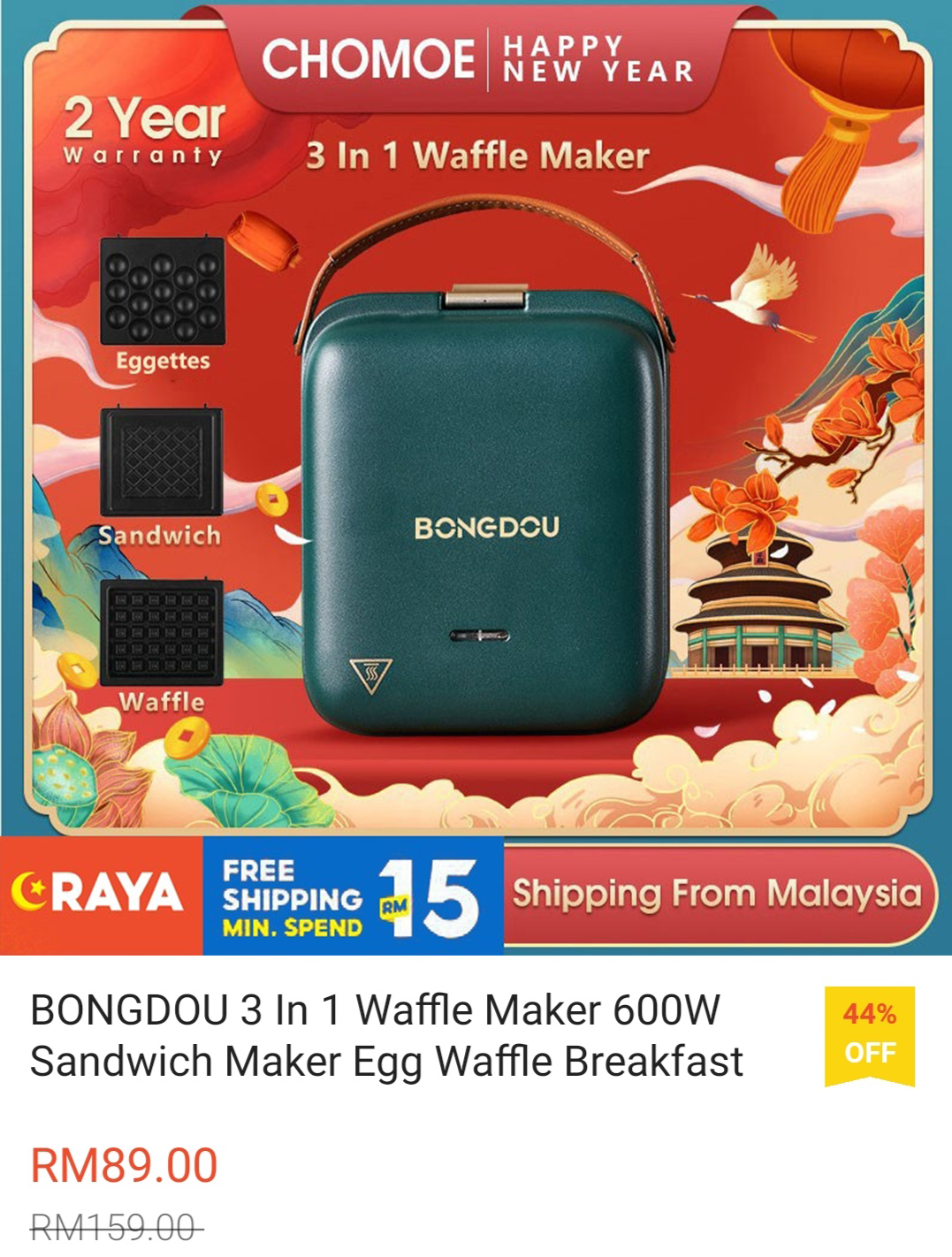 ⑧ BONGDOU 3 In 1 Waffle Maker 600W Sandwich Maker – RM159 RM89