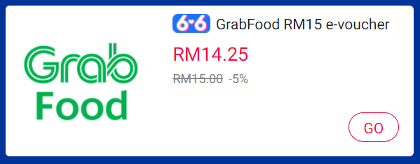i)GrabFood RM15 e-voucher – RM15 RM14.25;购买【点击这里】