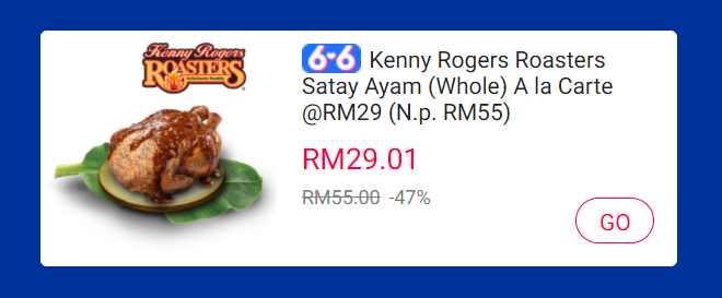 ii)Kenny Rogers Roasters Satay Ayam (Whole) A la Carte – RM55 RM29.01;购买【点击这里】