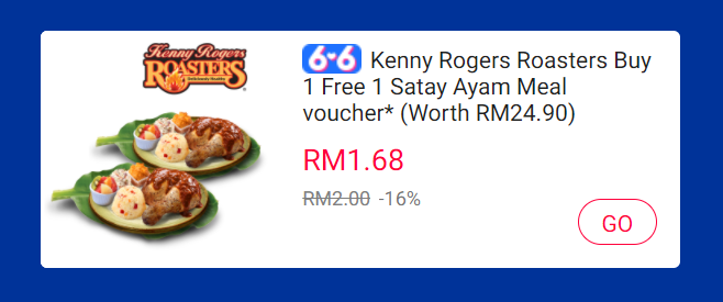 i)Kenny Rogers Roasters Buy 1 Free 1 Satay Ayam Meal voucher – RM2 RM1.68;购买【点击这里】