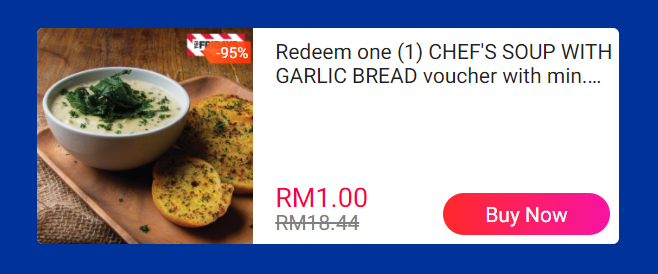 iv)edeem 1 CHEF’S SOUP WITH GARLIC BREAD voucher with min. spend of RM30 subtotal – RM18.44 RM1;购买【点击这里】