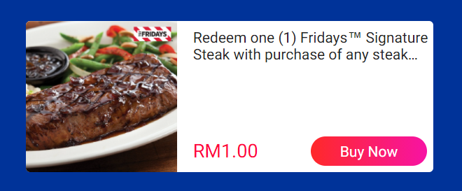 v)Redeem 1 Fridays™ Signature Steak with purchase of any steak from the a la carte menu -RM1;购买【点击这里】