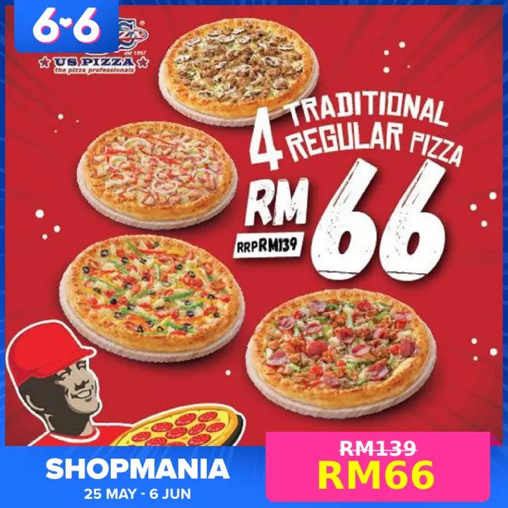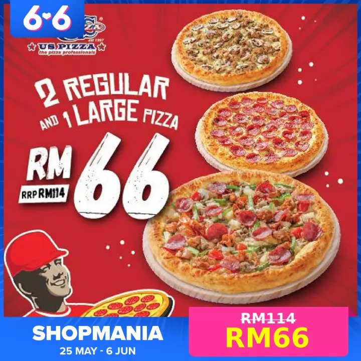 iii)2 Regular and 1 Large Pizza For RM 66 (All Traditional Flavour) – RM114 RM66;购买【点击这里】