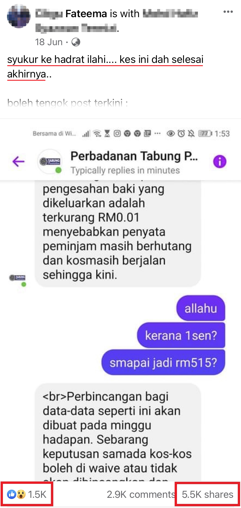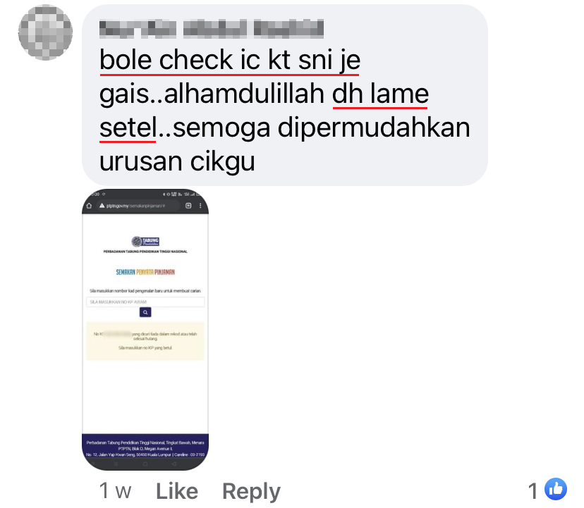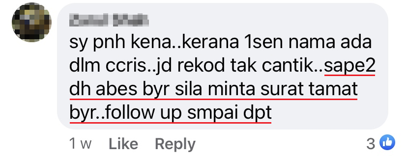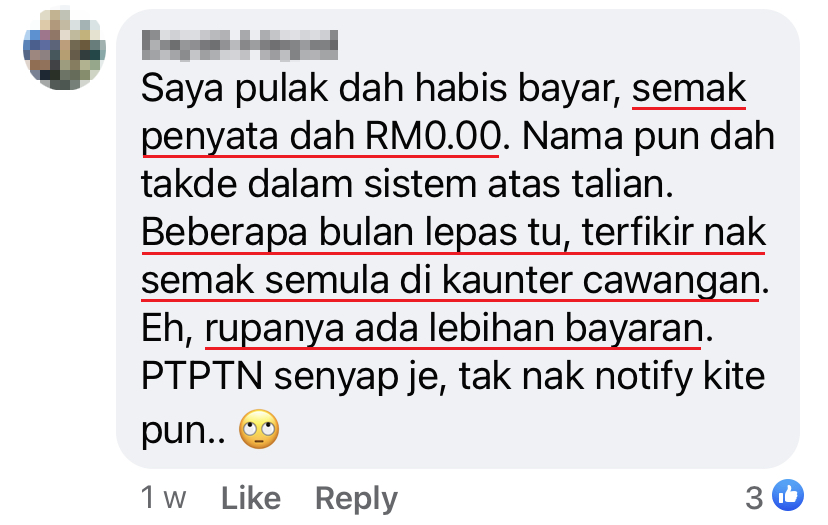 女事主希望通过帖文,劝所有PTPTN的借贷者查询自己的户头是否仍有余额,因为这些余额会导致他们被列入中央信贷参考资讯系统(CCRIS)中,并且引起不必要的法律纠纷。