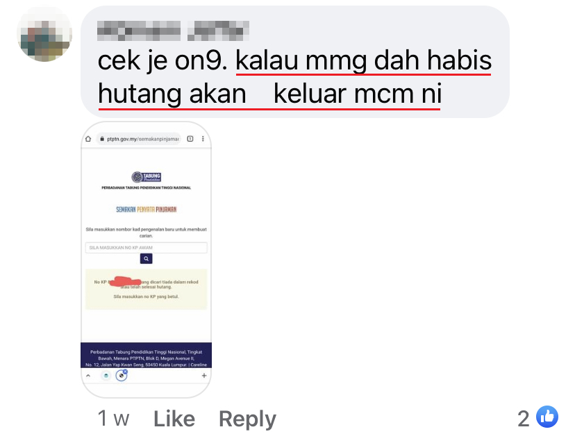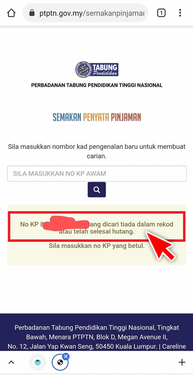 ▼ 建议大家可以这样查询:浏览PTPTN官网,输入身份证号码即可。