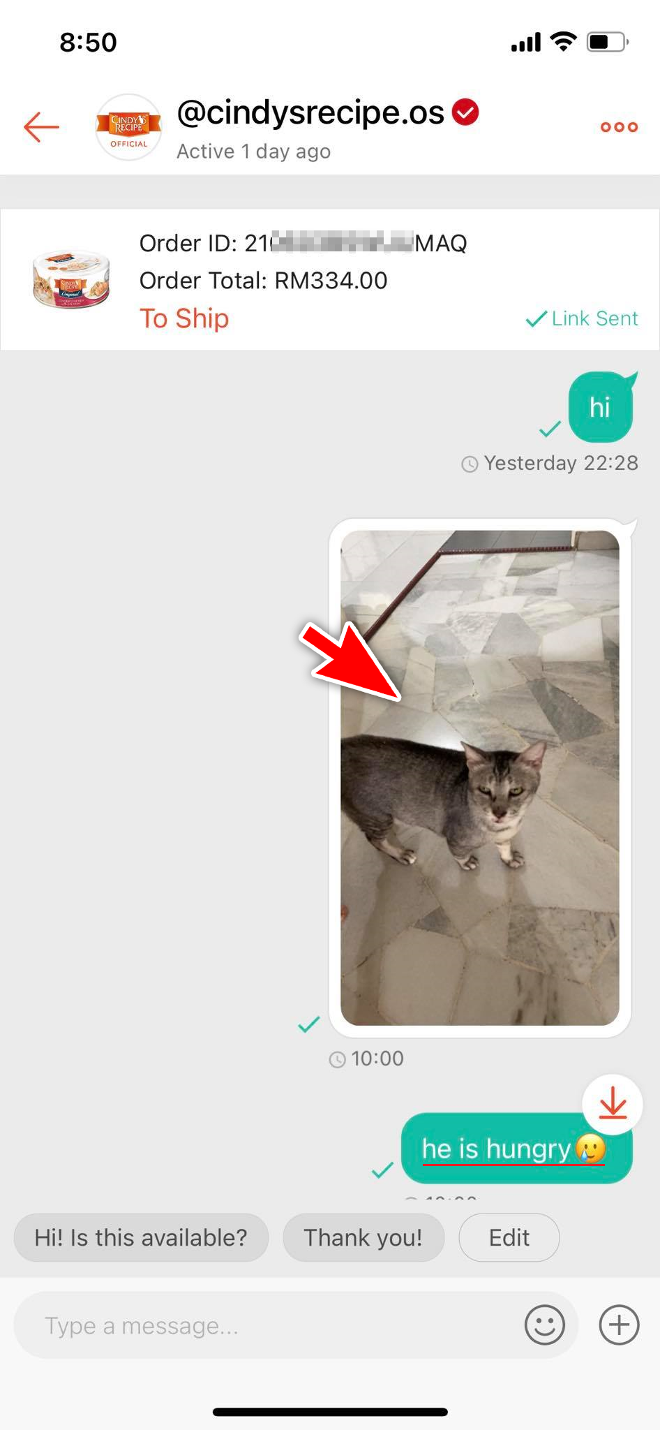 ▼ 买家直接晒出家里猫咪的照片,一副楚楚可怜的样子,然后告诉卖家:「它肚子饿了… 」