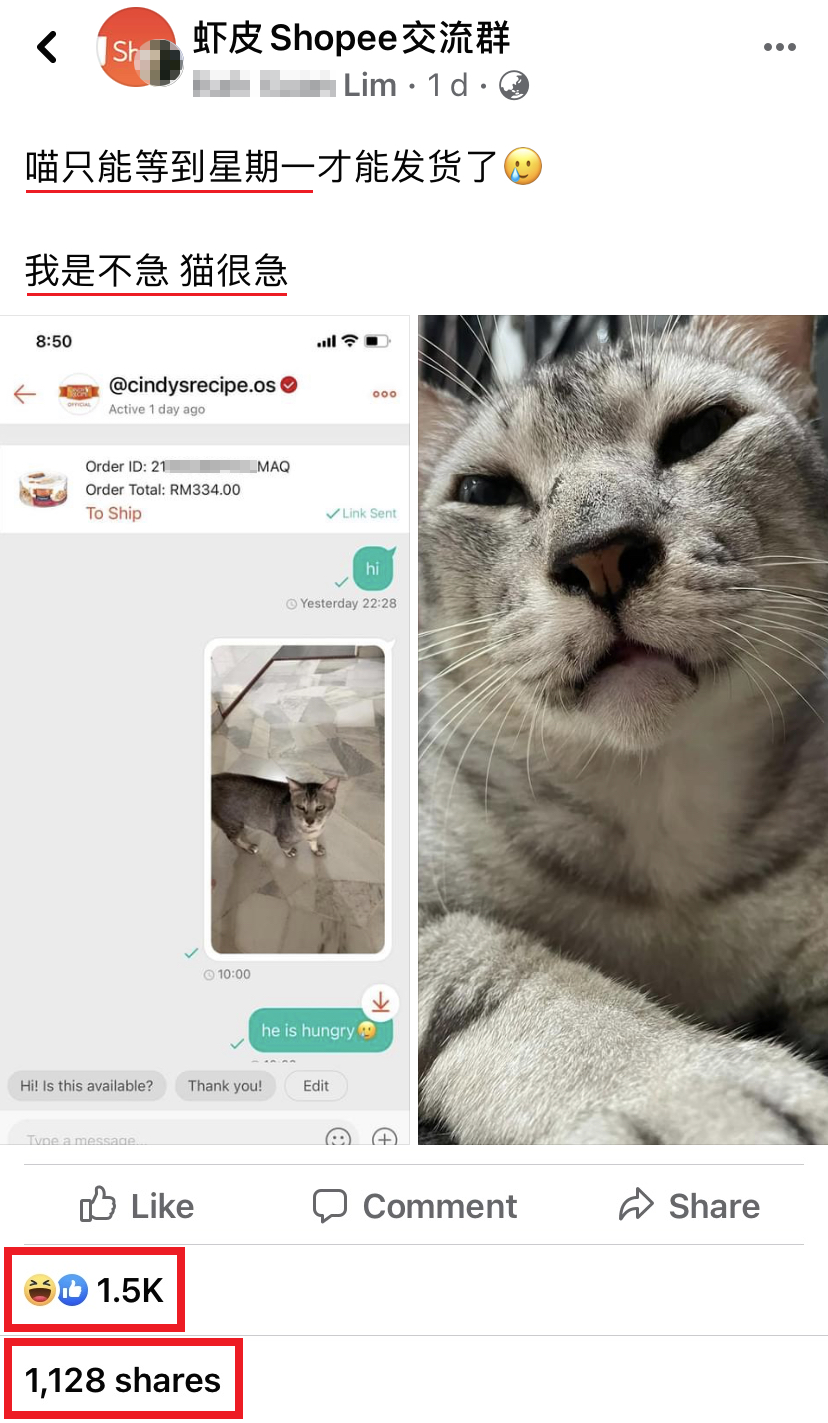 这名网友在 Shopee 网购了给宠物猫咪吃的猫粮,但由于家里的猫粮已经所剩无几,买家希望卖家能够尽快发货,但又怕催卖家会让卖家感到心情不悦,于是他就想到了一个两全其美的方法:让猫咪自己出面!