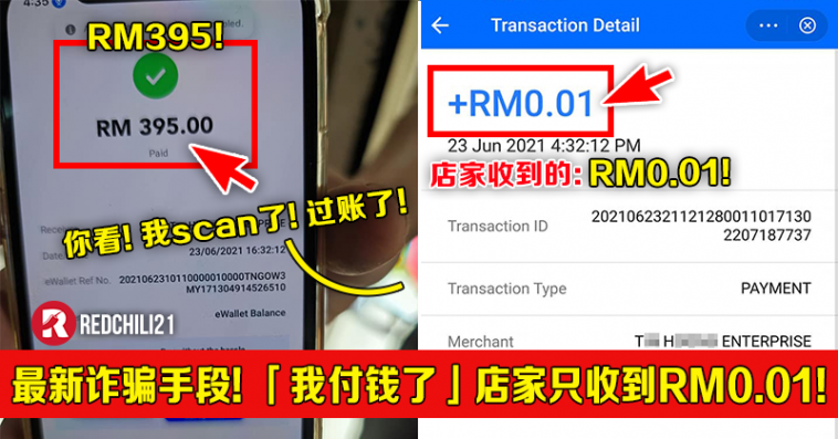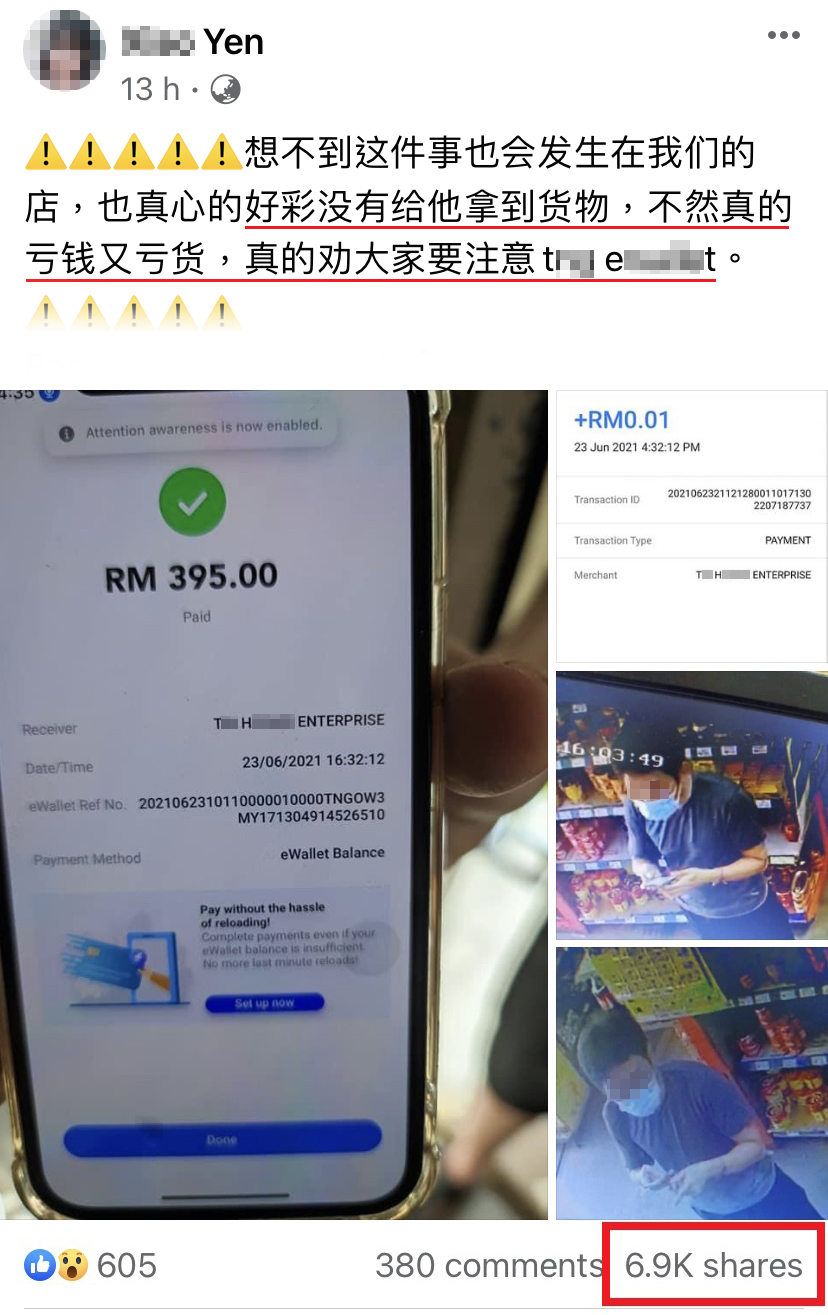 吉打一名网友昨晚在脸书发文叙述经历,有顾客来店里挑了最贵的物品,付款的时候使用电子钱包 App 试图诈骗,店家险些损失近 RM400!