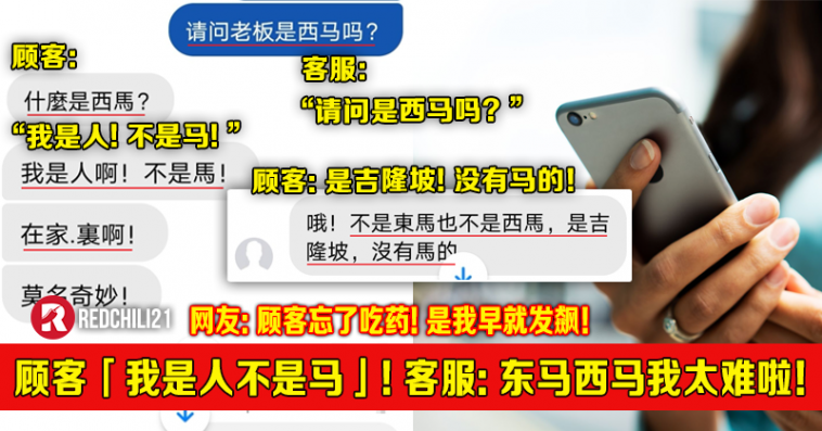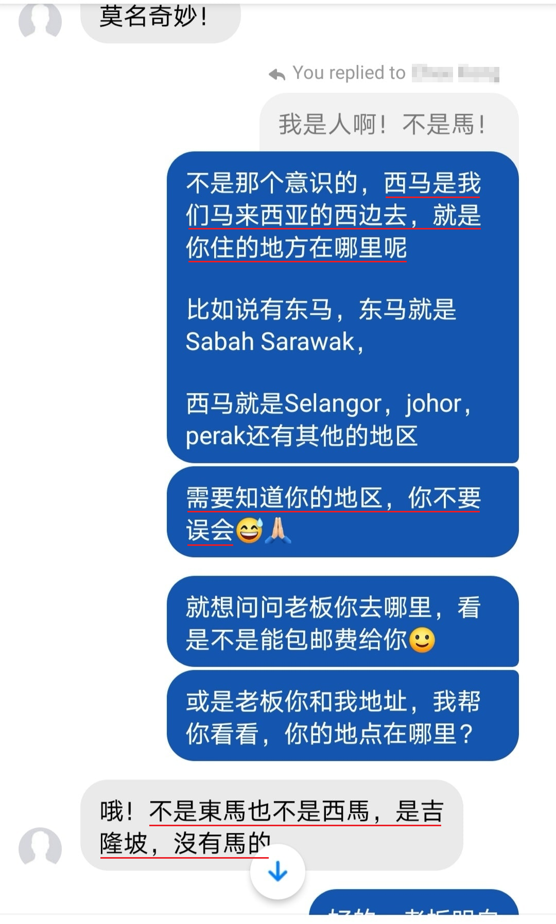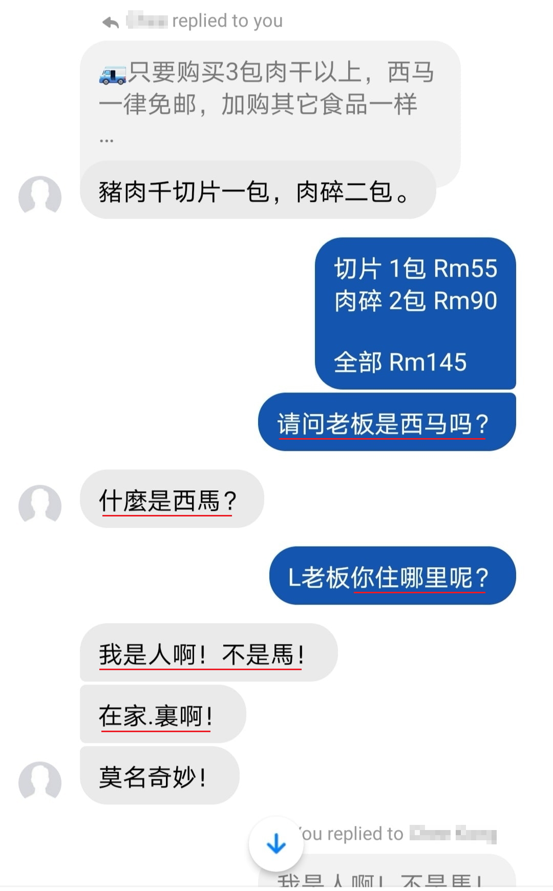 该名顾客向客服订购肉片和肉碎,客服回复价钱以后就跟顾客确认地址,问他是否居住在西马。顾客似乎不明白「西马」的意思,他问客服什么是西马,还加重语气地写道:「我是人啊!不是马!」