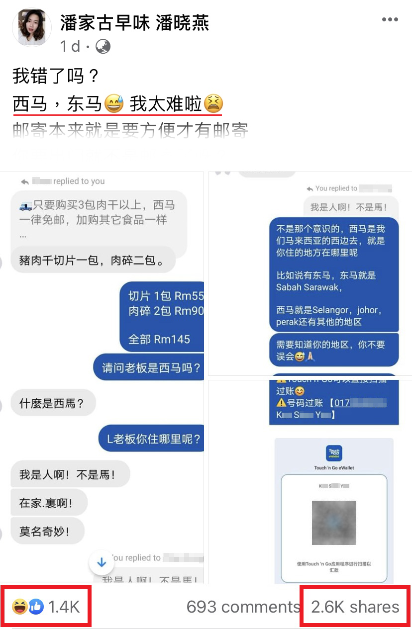 近日大马一个售卖手工食品的网络卖家在线上遇到奇葩顾客,好声好气地问他居住在“西马or东马”,结果他的回答把网民都惊呆了!