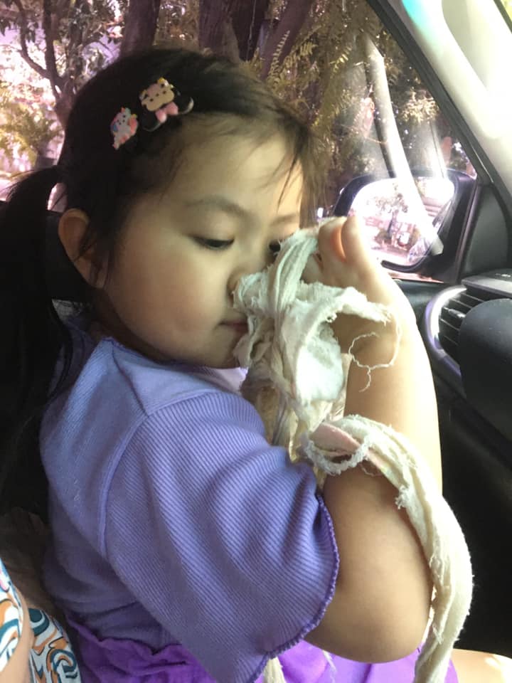 ▼ 从照片中可以看到,小妹妹的挚爱已经是一条不成形的破布,但她依然对它如痴如醉!