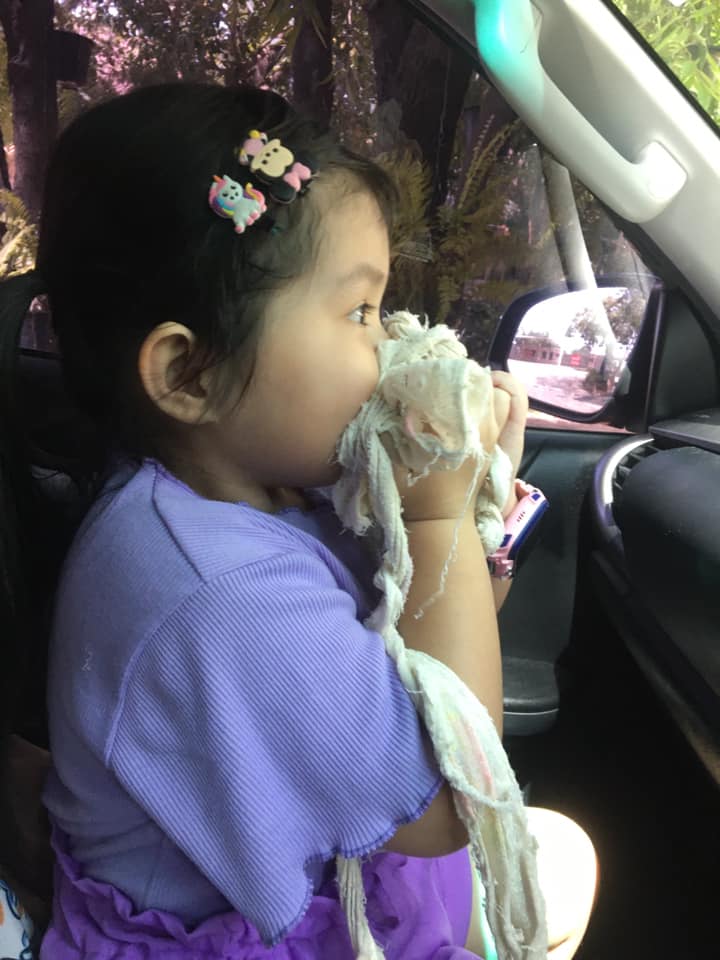 ▼ 年仅5岁的小妹妹,坐在车上还不忘手拿着最爱的“臭臭”。大口一吸!啊~就是这个这个手感、这个味道~
