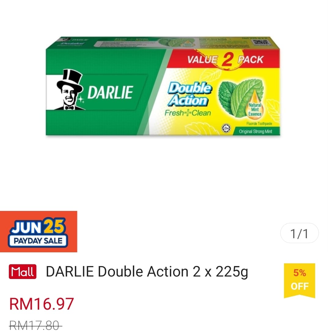 家里的牙膏是否还有存货?!如今2支装Darlie 黑人牙膏(225g)只需RM11.97! 平均一支只需RM5.99!