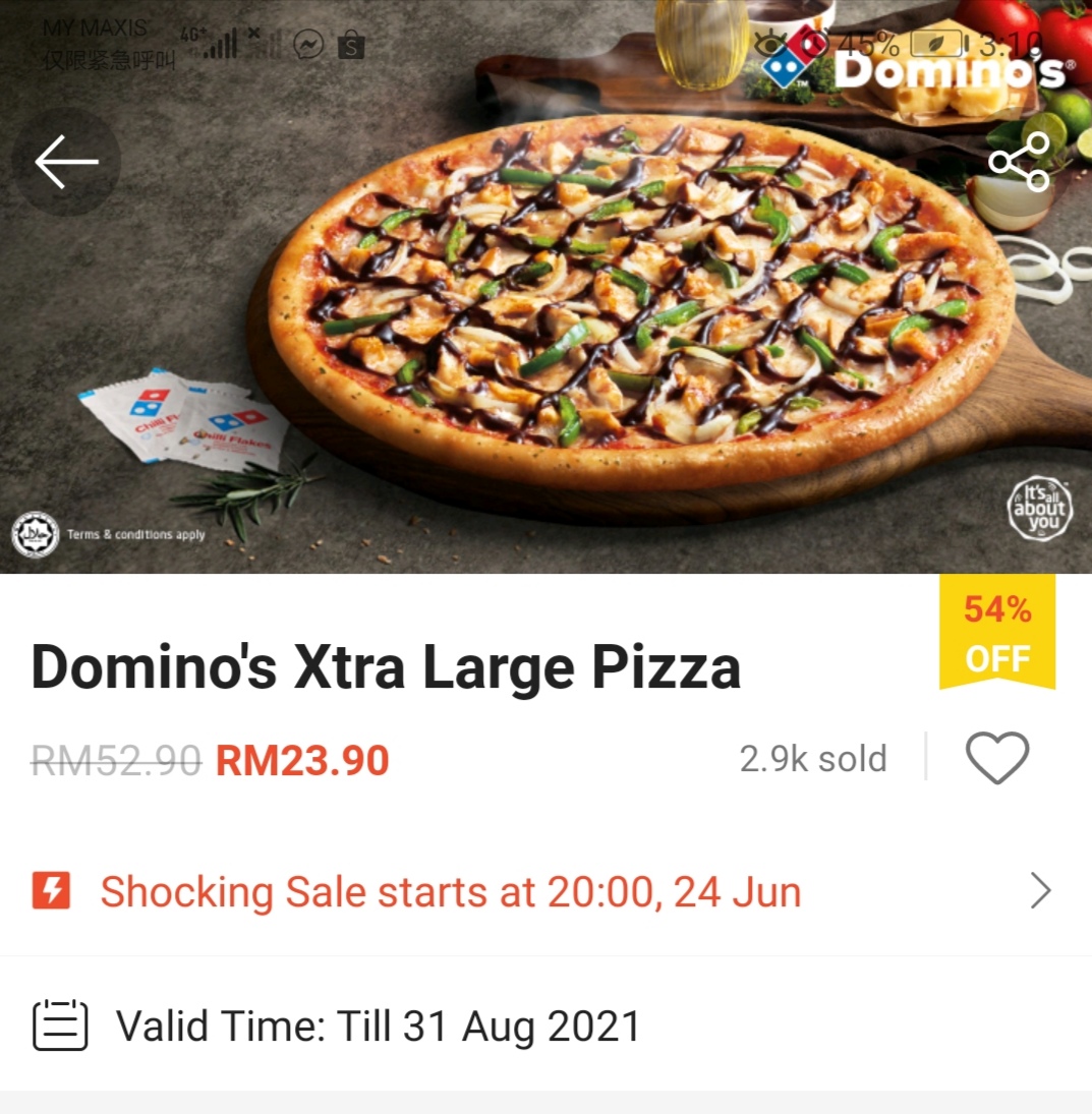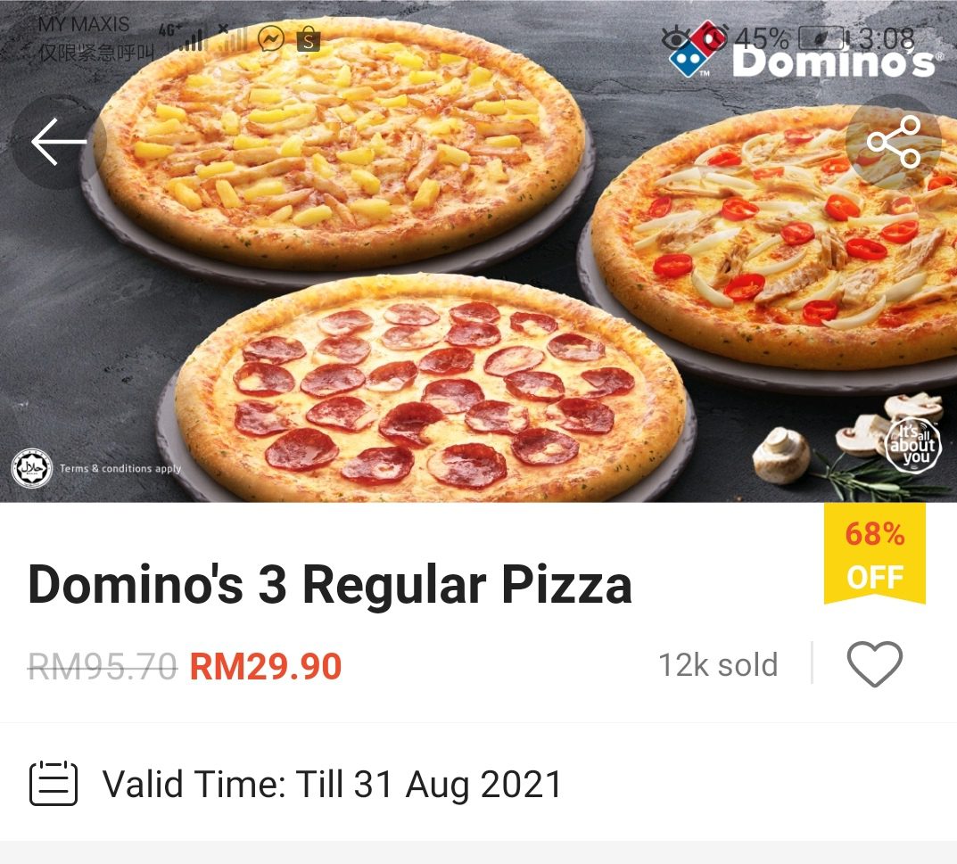 这项优惠是由Shopee 推出Domino’s Pizza 美食券!3份Regular Pizza 只需RM29.99,平均一份RM9.97(RM10都不到)!而且无需出门也能把Pizza 送到你家哦!
