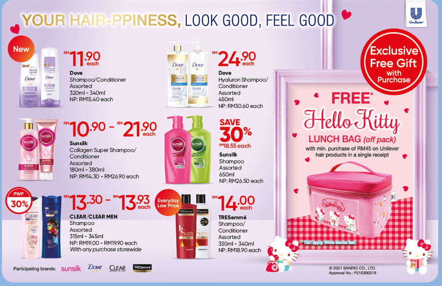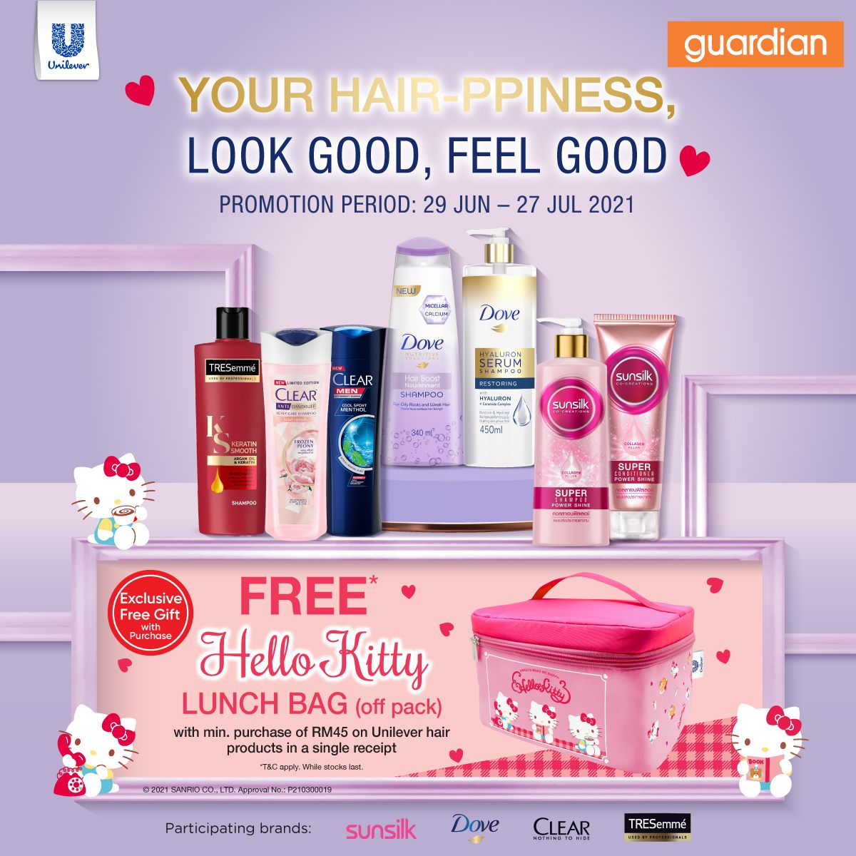 从即日起至7月27日,Guardian 免费送出限量版Hello Kitty 手提饭盒袋 (Lunch Bag)!只需购买RM45 或以上Unilever 旗下品牌护发产品,就可免费获得Hello Kitty 系列手提饭盒袋!