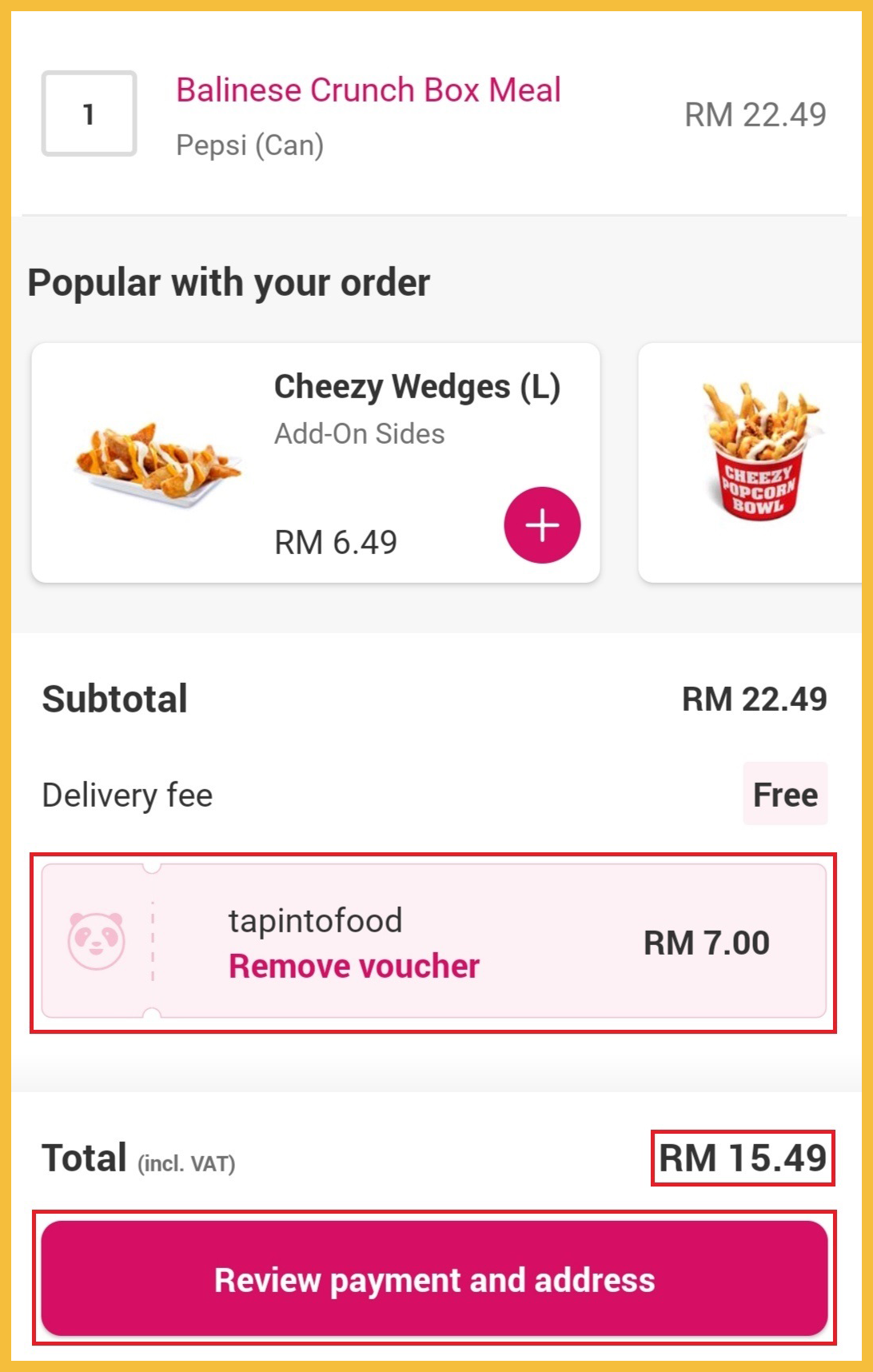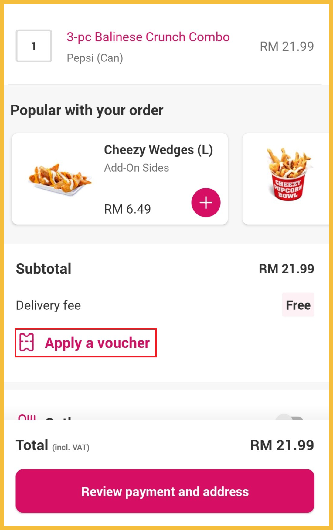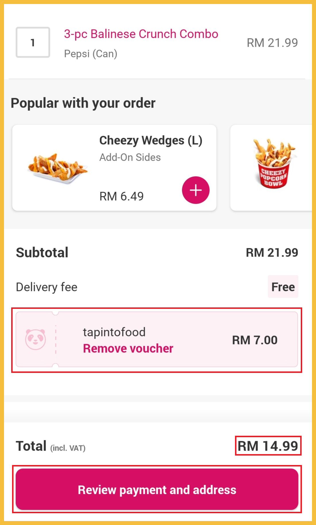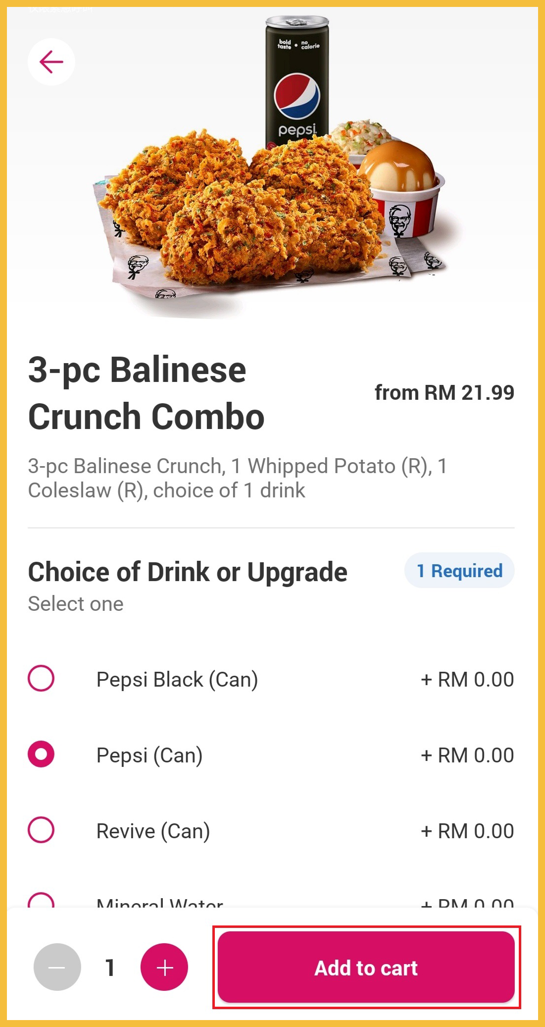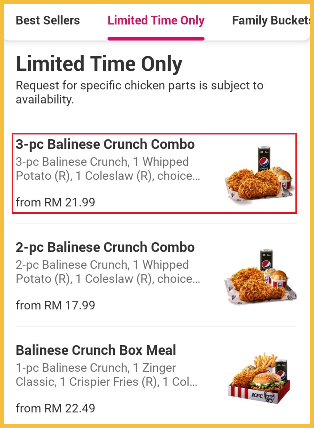 ※ 一份3-pc Balinese Crunch Combo(原价RM21.99),折扣【TAPINTOFOOD优惠码后只需RM14.99