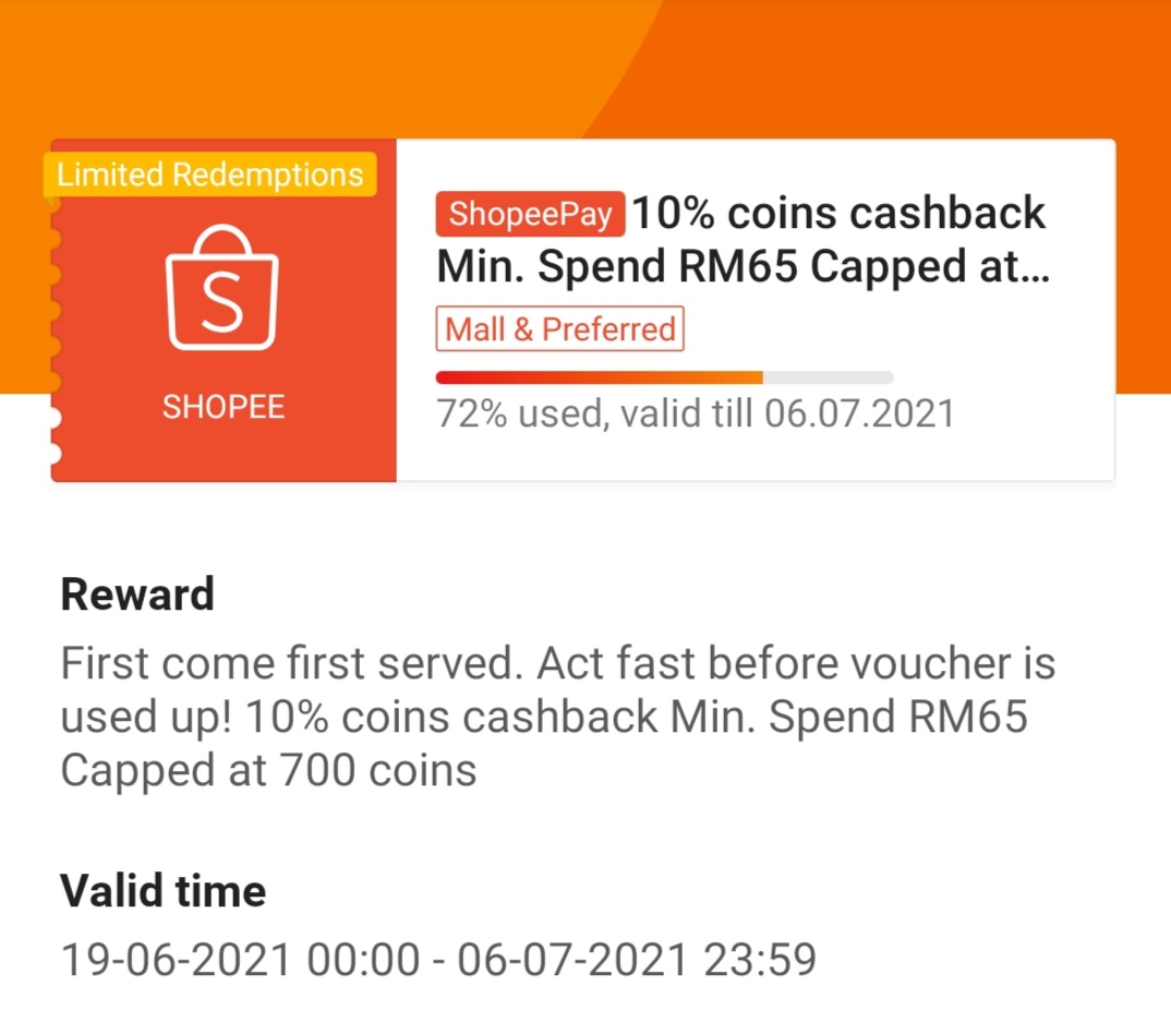1)消费RM65,可获得10%现金回扣,高达700Coins(RM7)