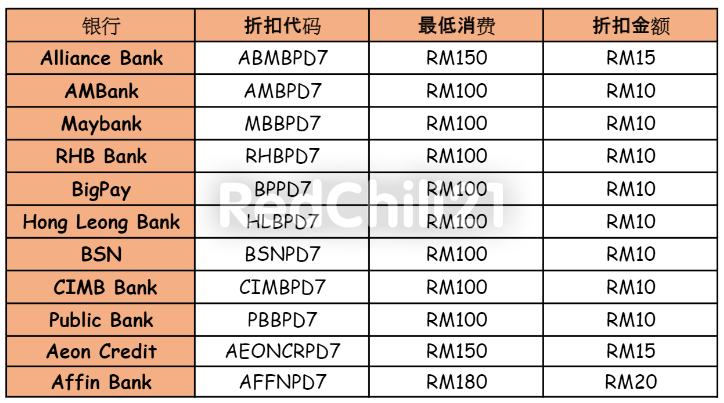 1)Alliance Bank —— 消费RM150,可折扣RM15