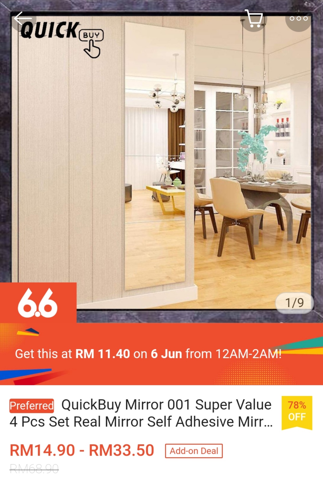 ▪ QuickBuy Mirror 001 Super Value 4 Pcs Set Real Mirror Self Adhesive Mirror Wall Mounted Mirror (22x22cm Each size) – RM68.90 RM11.40