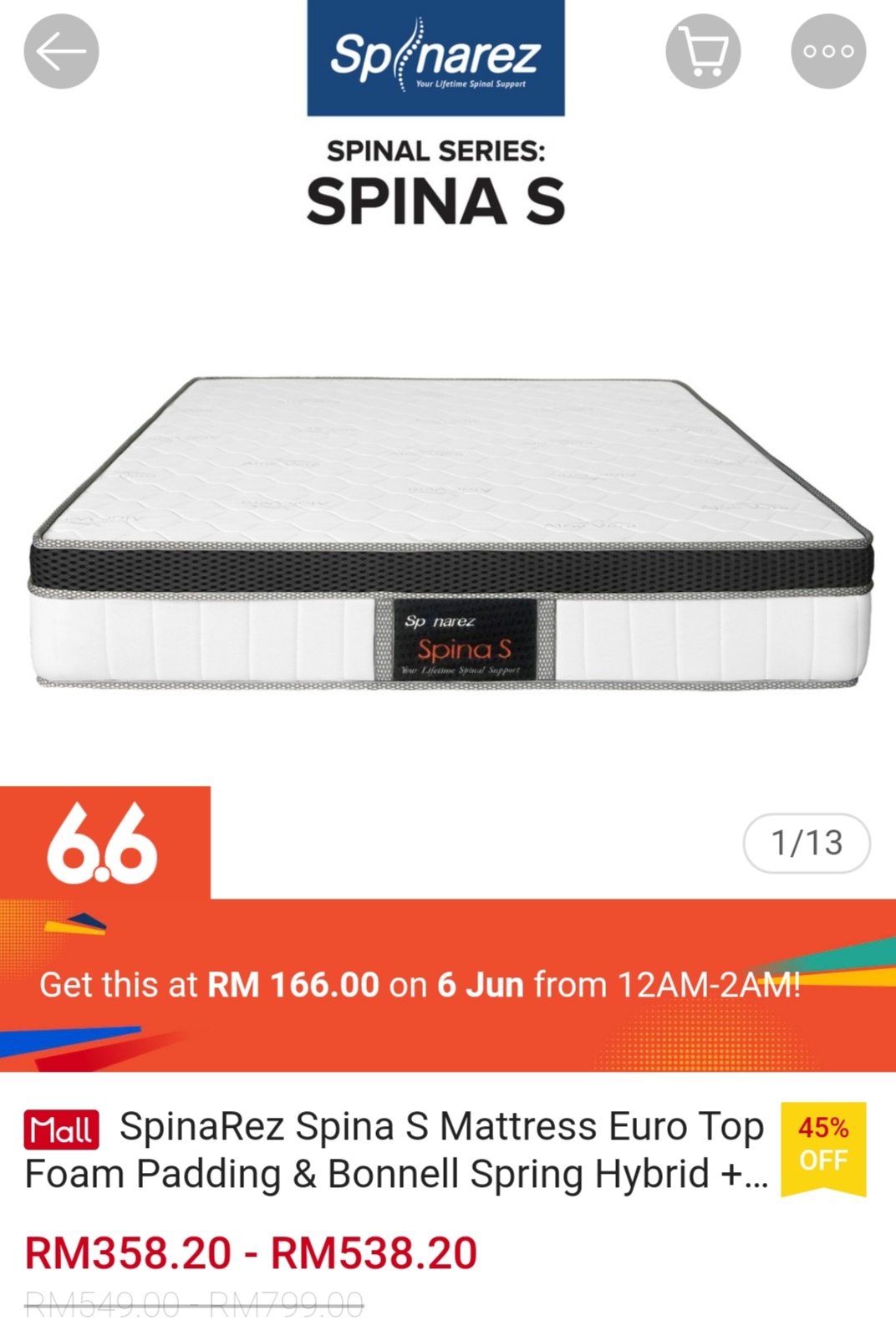 ▪ SpinaRez Spina S Mattress Euro Top Foam Padding & Bonnell Spring Hybrid + Coconut Fiber (10″)- RM549 – RM799 RM166