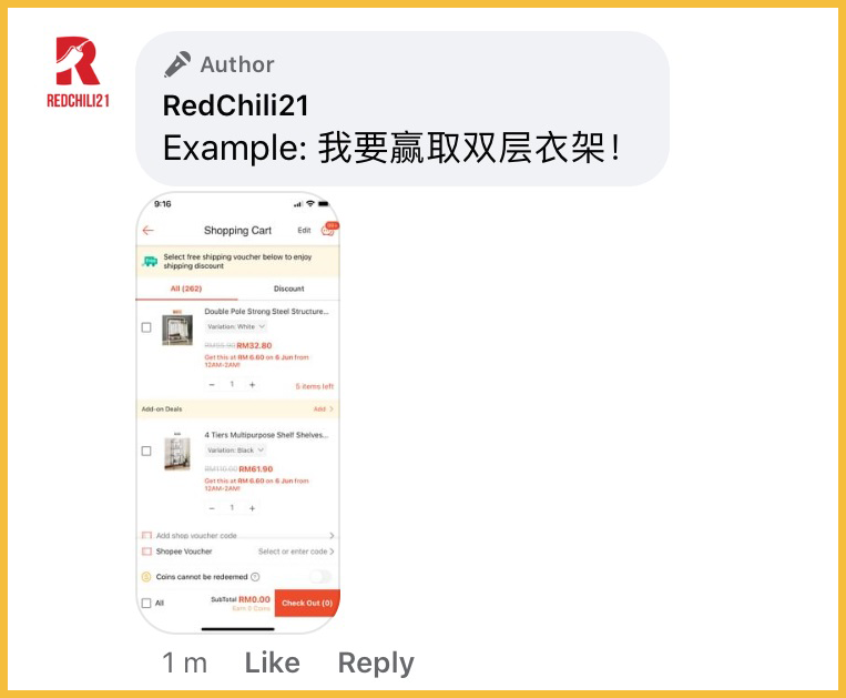 3个步骤就搞定!RedChili21 将会从留言中抽出5 位幸运儿!记得一定要截图留言,说不定你就是那位幸运儿!(活动将于6月11日结束,6月12日RedChili21将公布5位幸运儿)