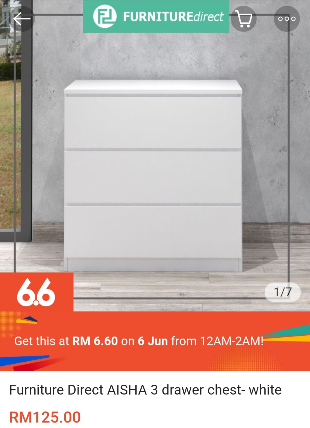 ▪ Furniture Direct AISHA 3 drawer chest- white – RM125 RM6.60