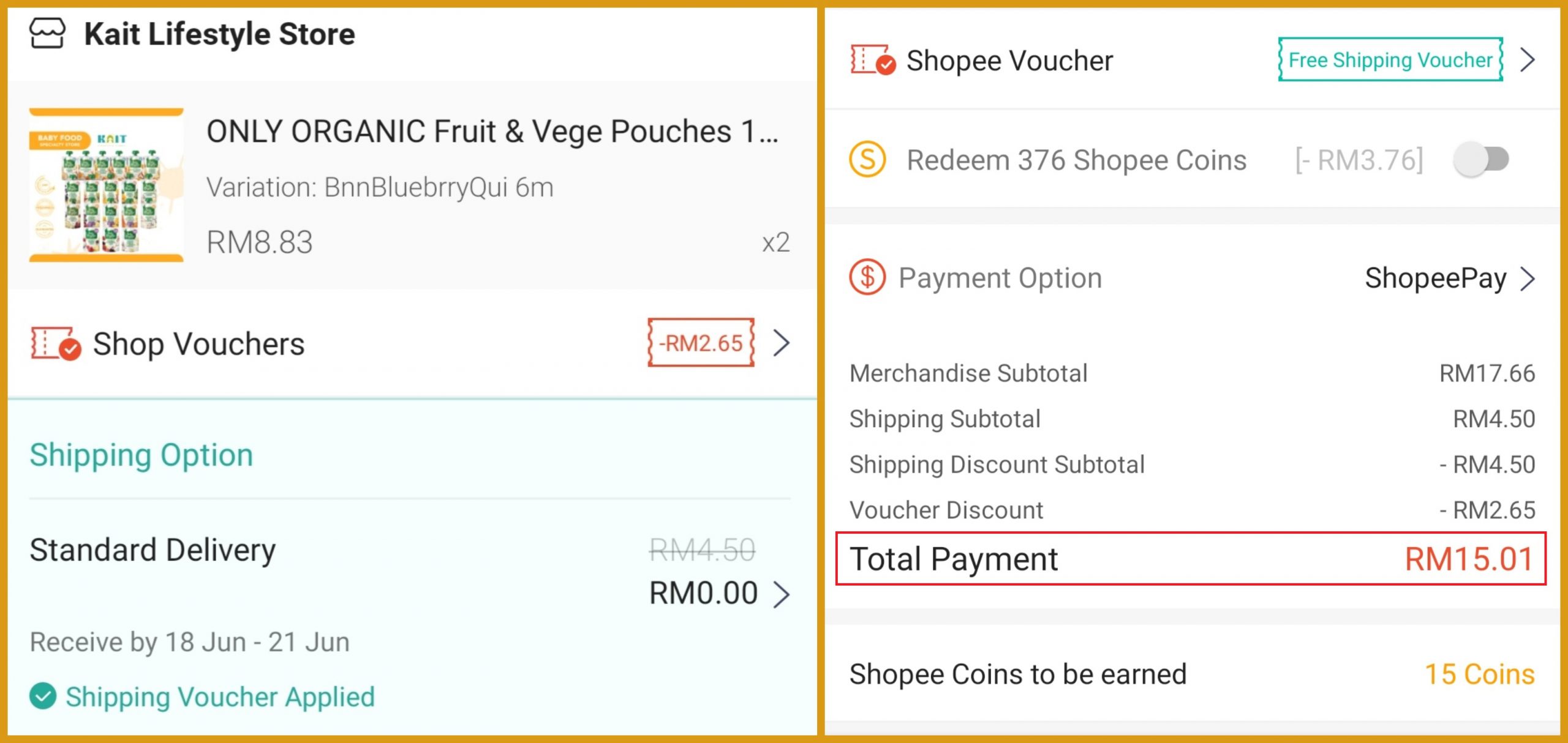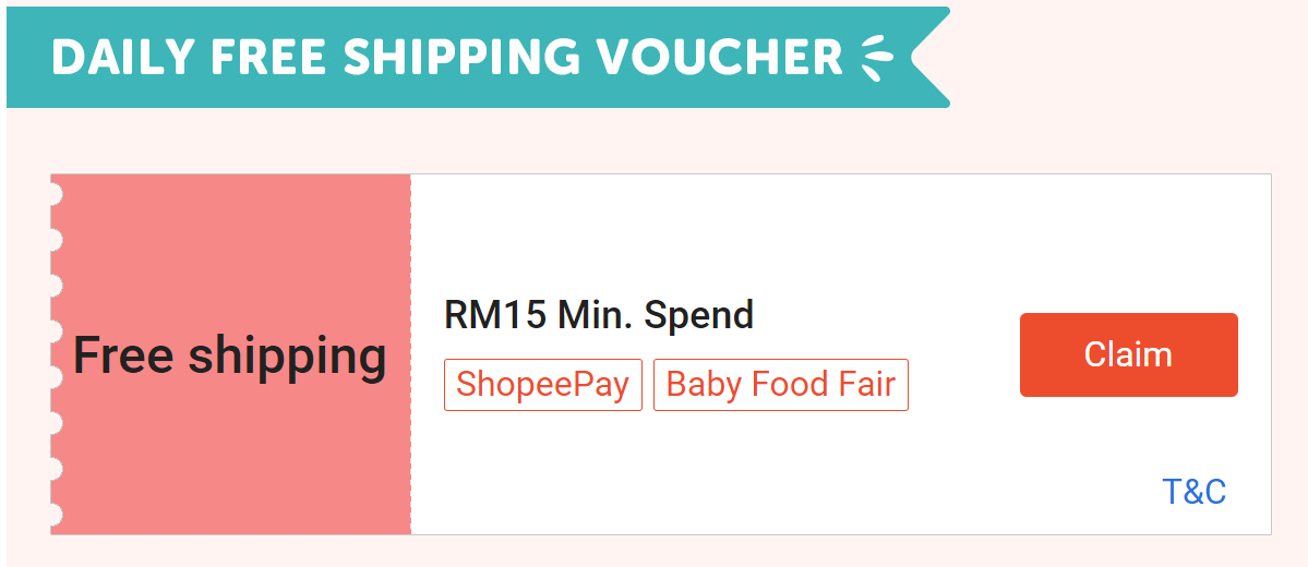 ② 领取Shopee 最低消费RM15 的免邮券!(注意:这张免邮券仅限Baby Food Fair商品)