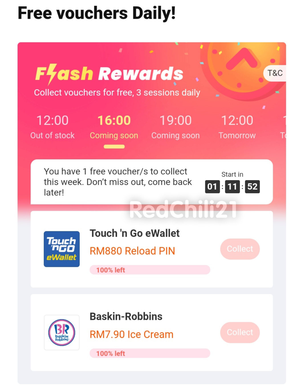 ※需要注意的是,每日时段所派出的优惠券数量为2张RM880 Reload Pin 及100张Baskin Robbins RM7.90 雪糕优惠券!
