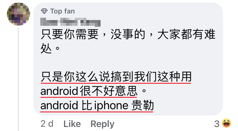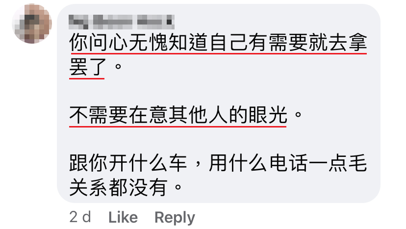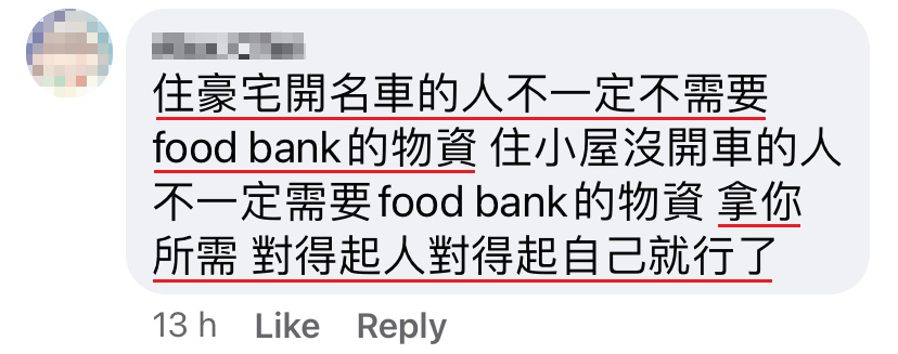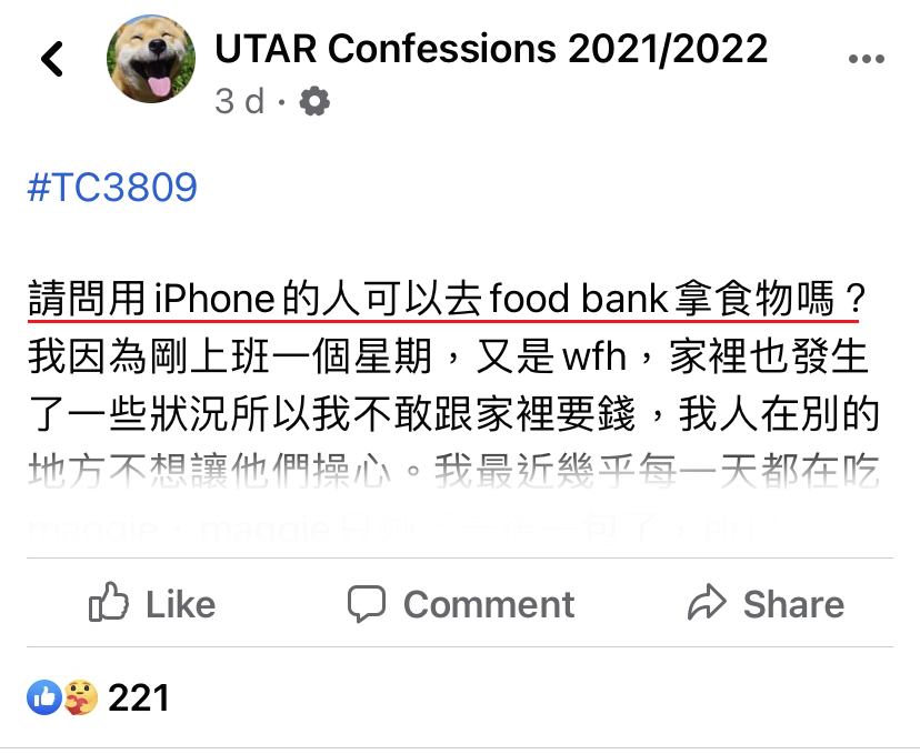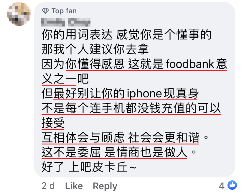有些缺粮的人虽然他们是真的有这个需求,但对于去 Food Bank 领取粮食,他们还是有所顾虑,担心被人批评。就像这名网友,因为使用的手机是 iPhone 所以不敢去 Food Bank 拿食物。
