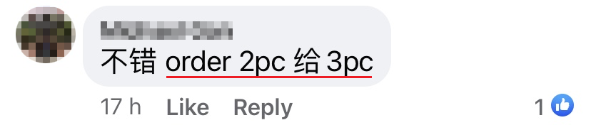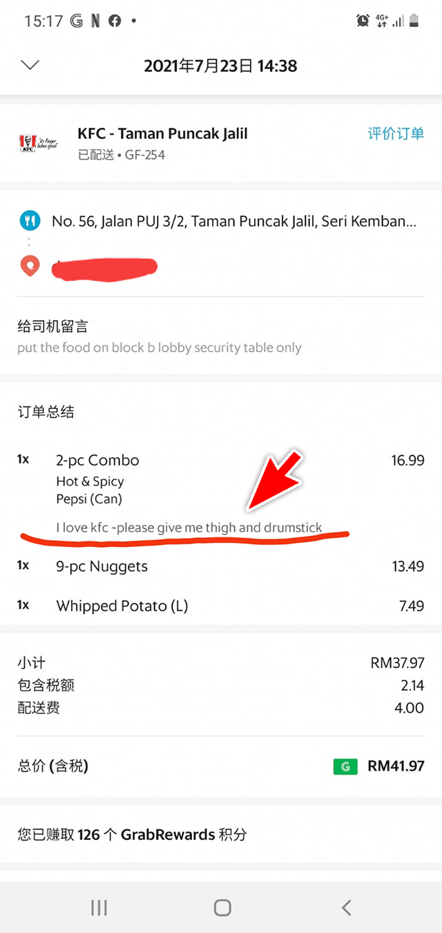 ▼ 该名网友通过 GrabFood 点外卖,订购 KFC 的1份2块炸鸡套餐、1份9块式的鸡肉块以及1份马铃薯泥,并在炸鸡套餐底下备注:「I love KFC – Please give me thigh and drumstick.(我爱KFC – 请你给我鸡二度和鸡腿。)」