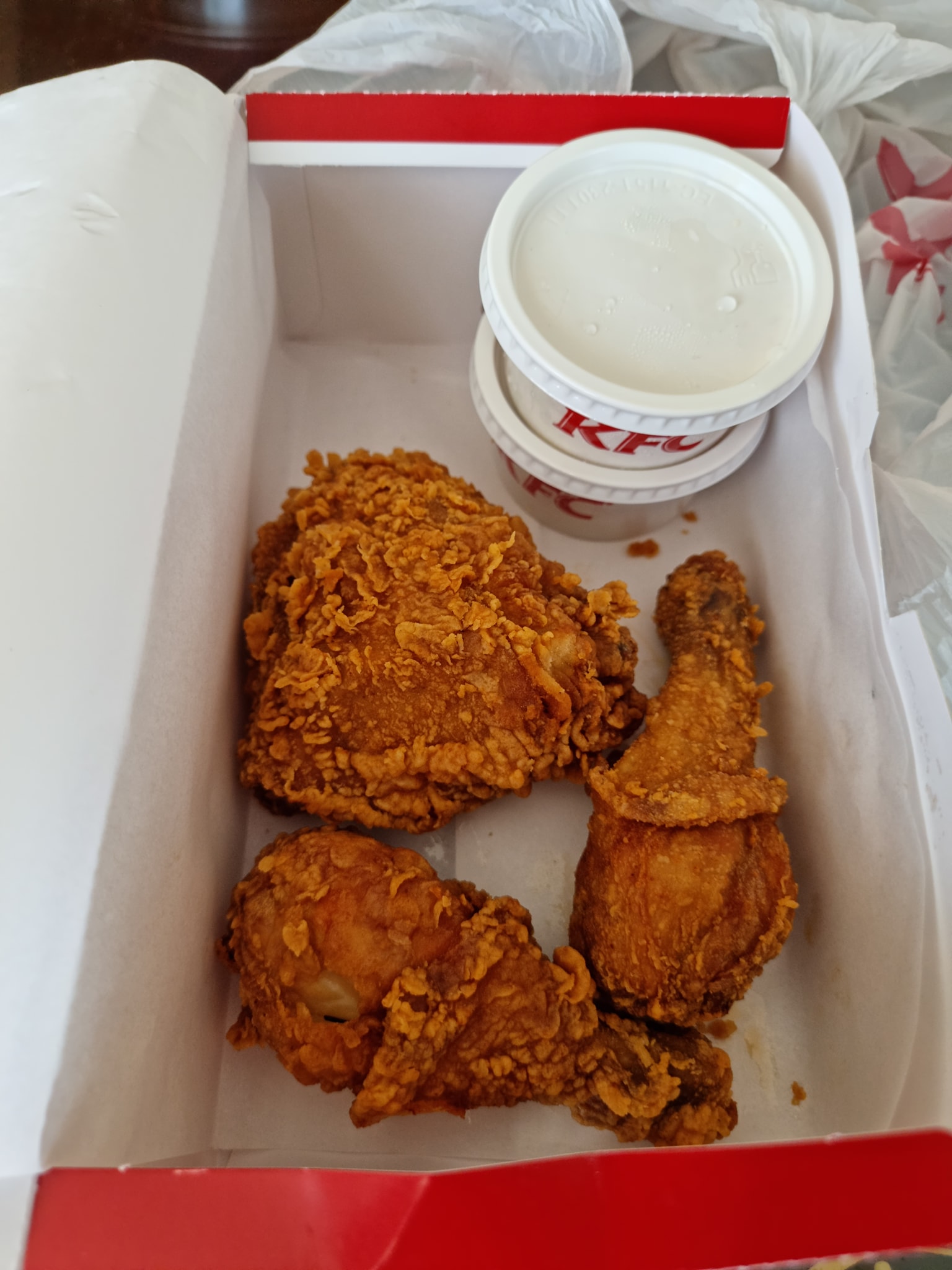 ▼ 外卖到了以后打开一看,KFC不但完成了他订单上的心愿,而且还有意外的惊喜!2块炸鸡套餐居然有3块炸鸡,KFC送了多一块炸鸡腿给他!