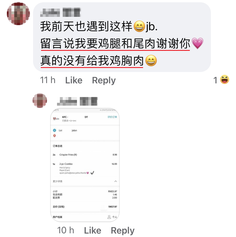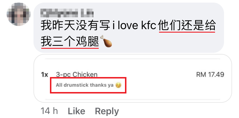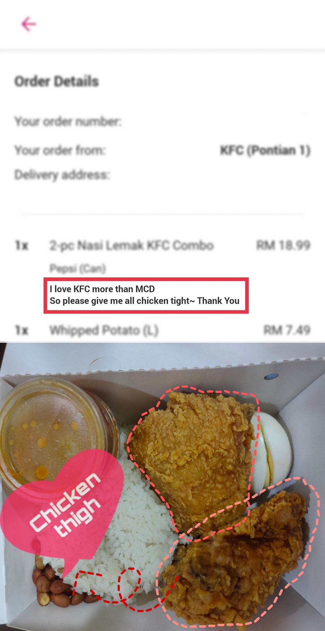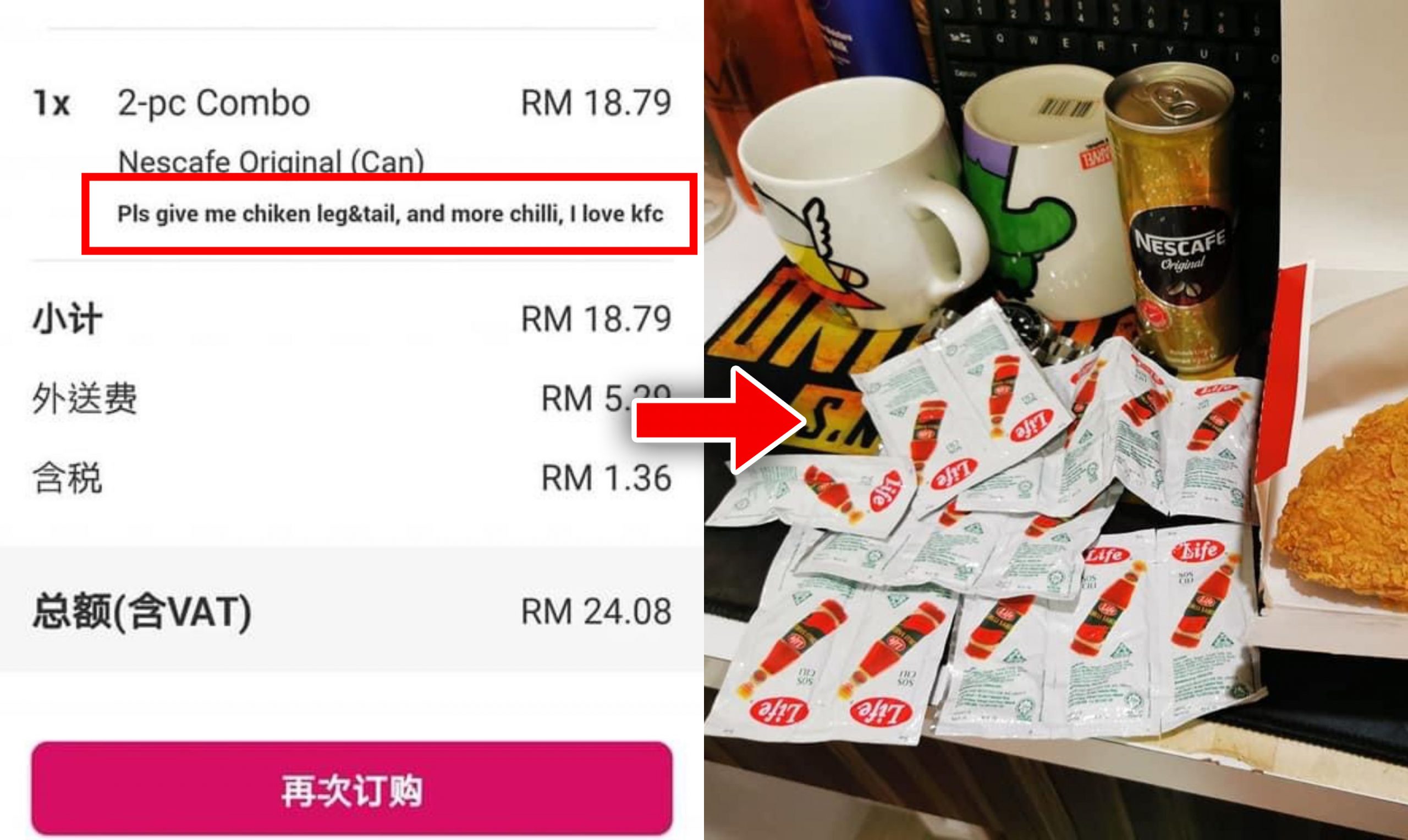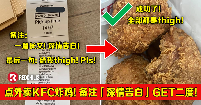 大马网友点外卖KFC炸鸡用妙招!备注写超长「深情告白」成功GET他要的Thigh!