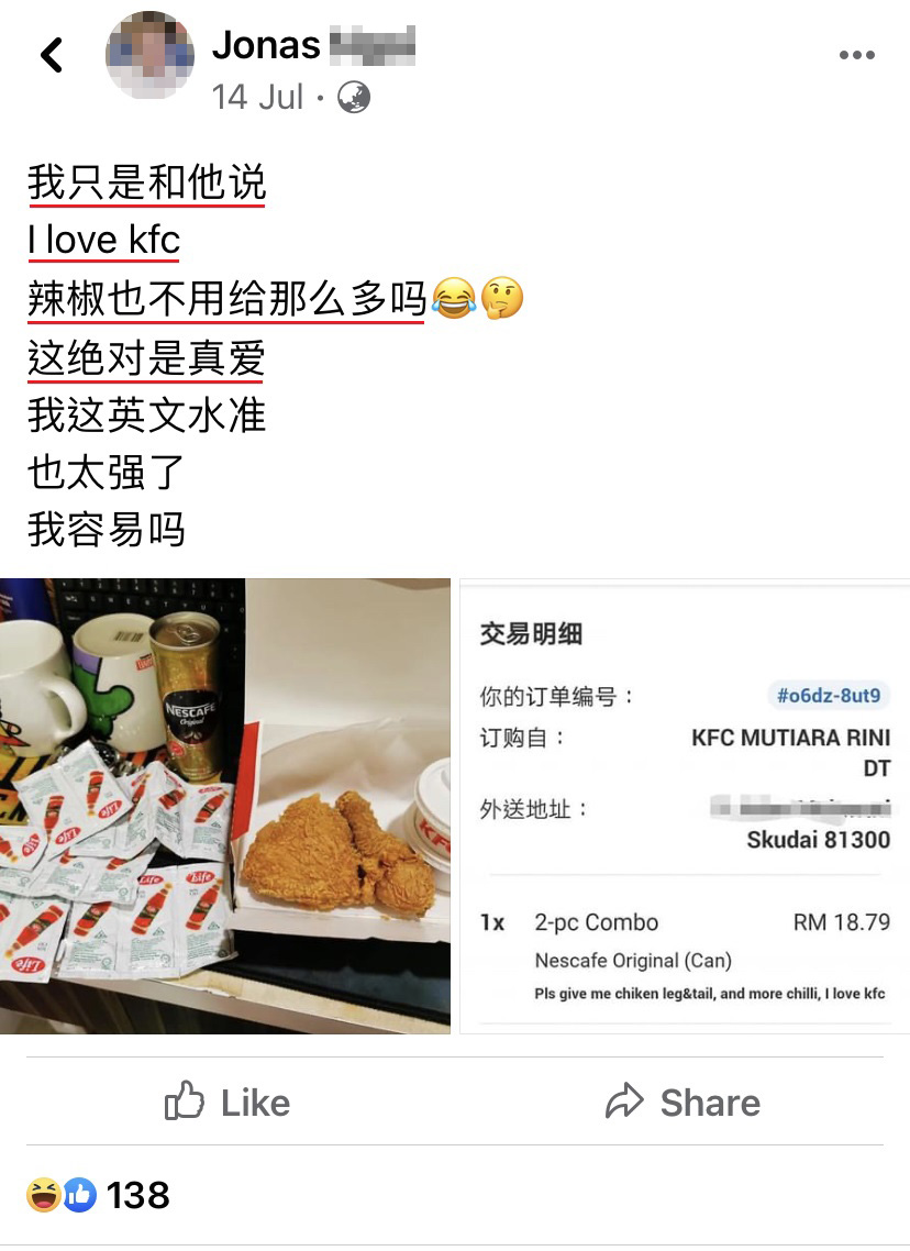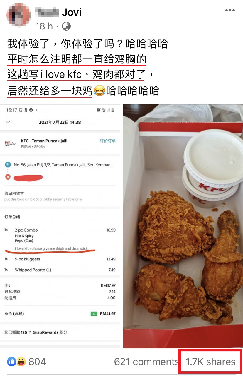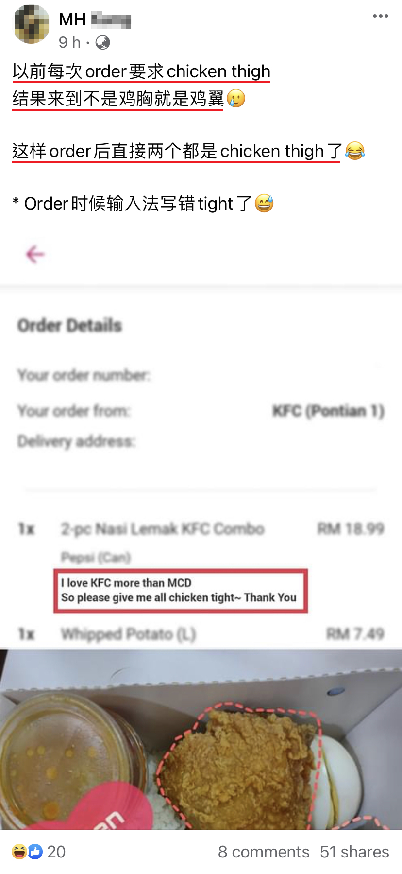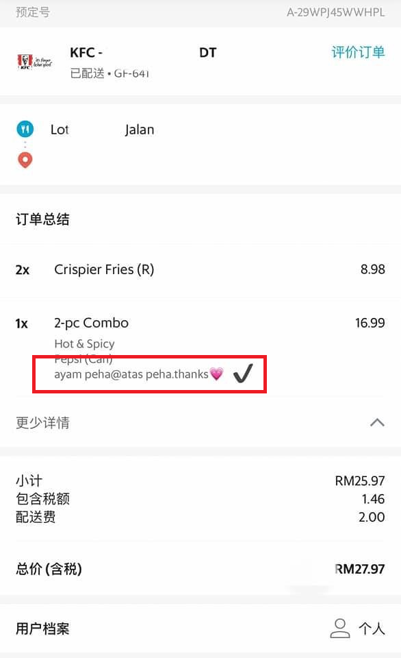 大马网友点外卖KFC炸鸡用妙招!备注写超长「深情告白」成功GET他要的Thigh!