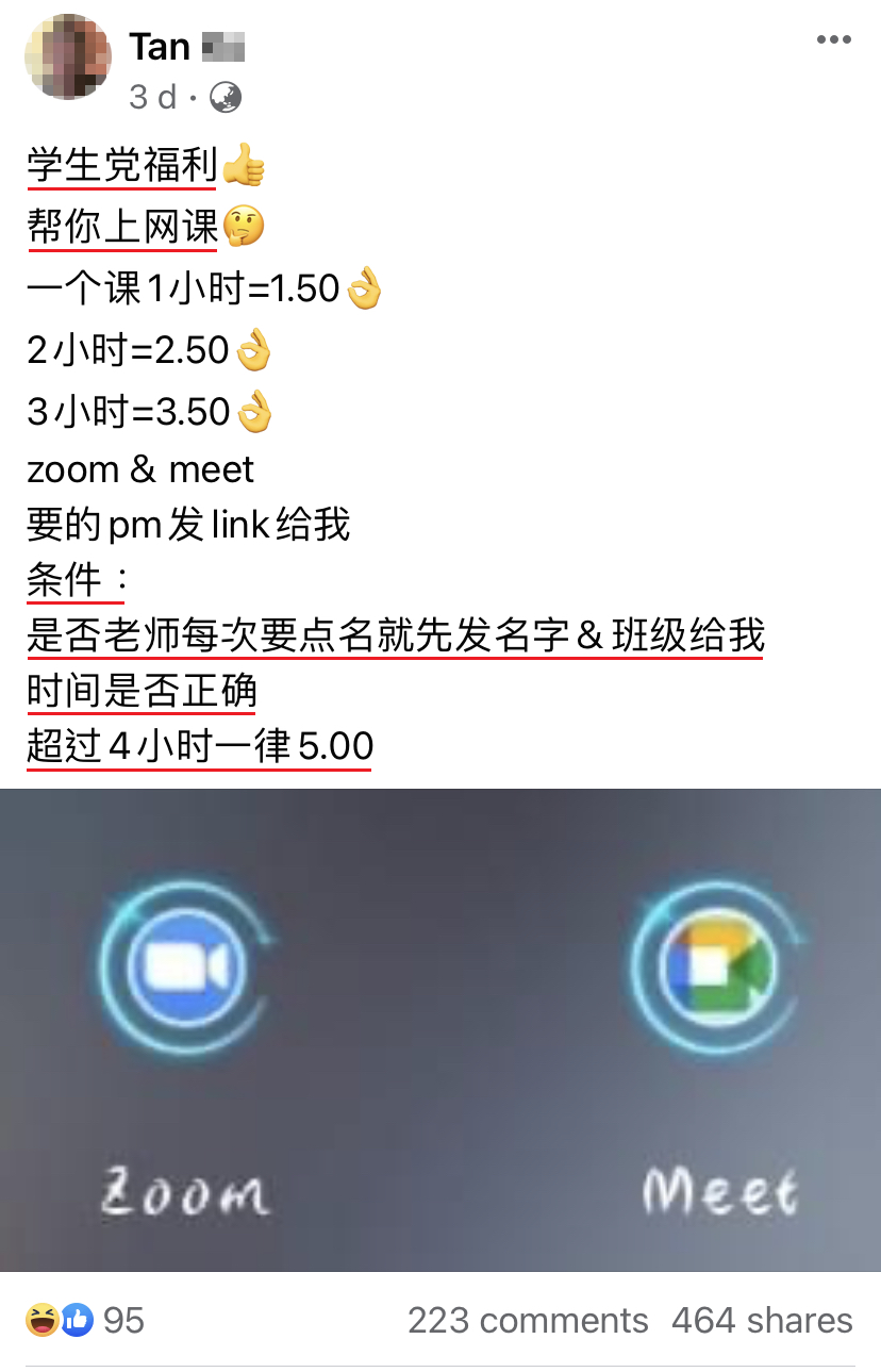 一名网友在“网络工作 兼职群”的群组里发文,声称是给学生党的新福利。只要是 Zoom 或 Meet 的网课都可以帮你上课,最低为一小时RM1.50起跳。