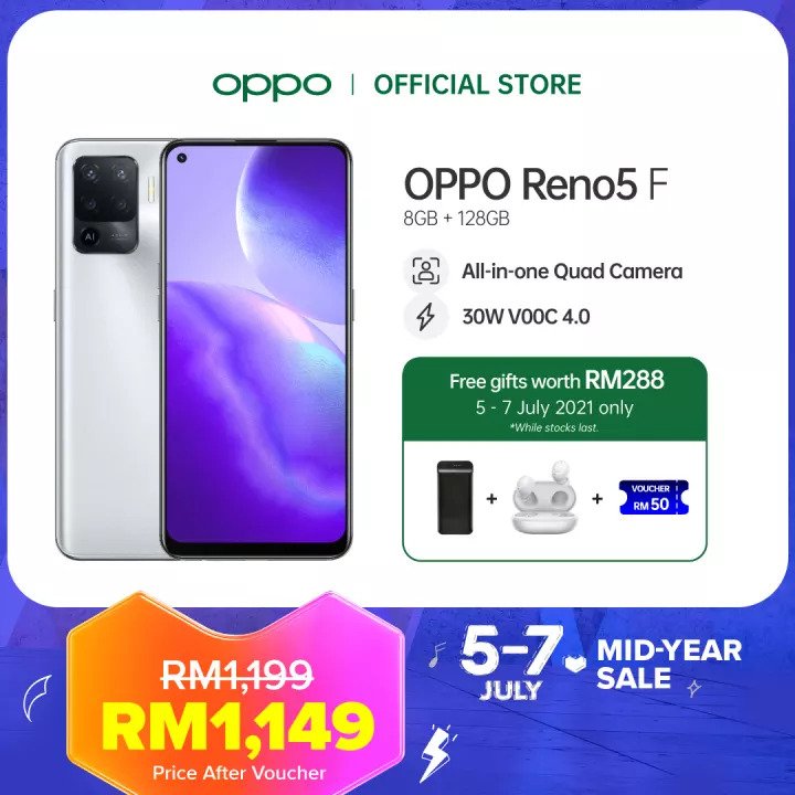 ▪ OPPO Reno5 F (Crystal Silver Edition;8GB+128GB) Smartphone – RM1199 RM1149【点击这里】