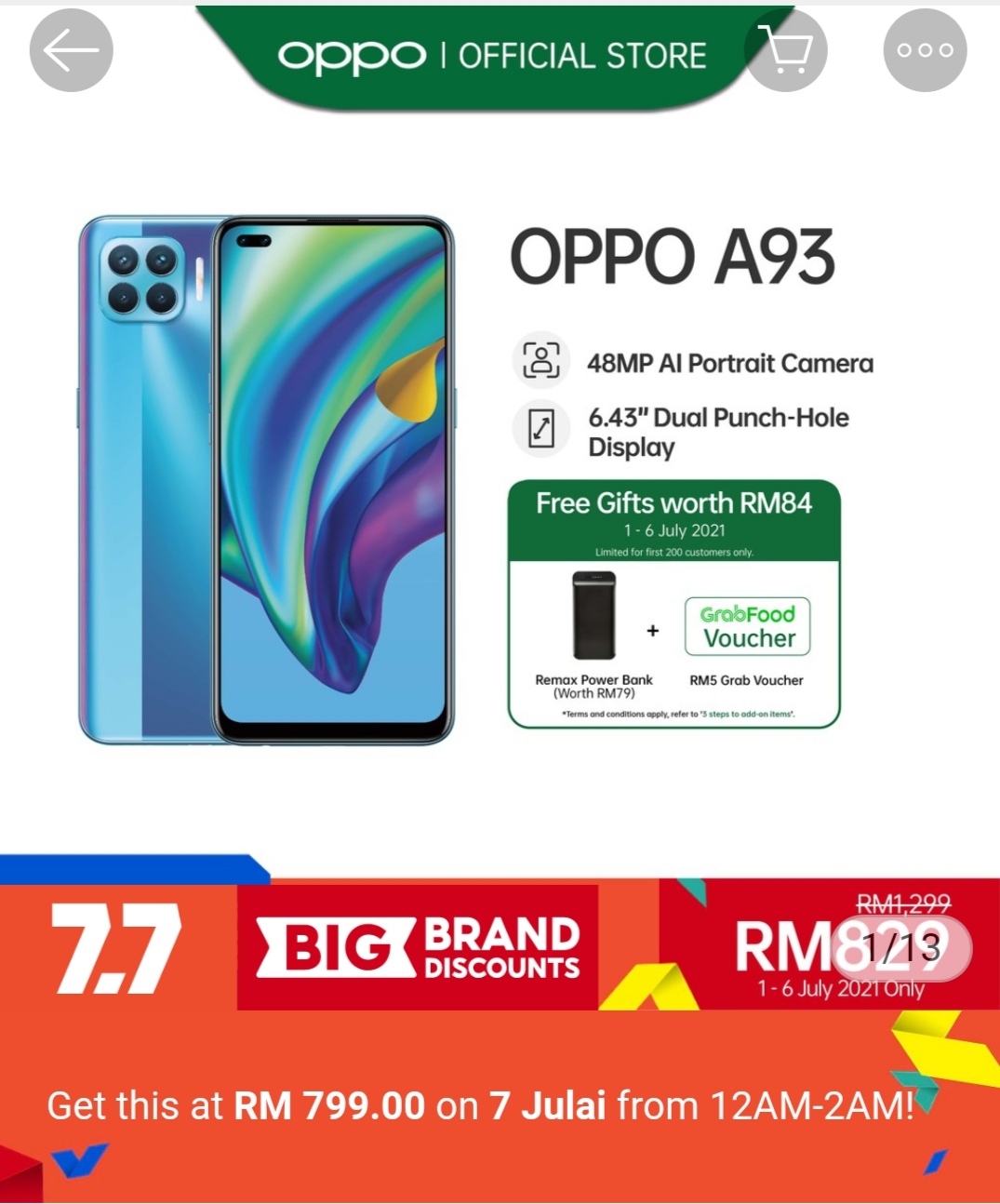 ▪ OPPO A93 Smartphone (8GB RAM+128GB RAM) – RM1299 RM799【点击这里】