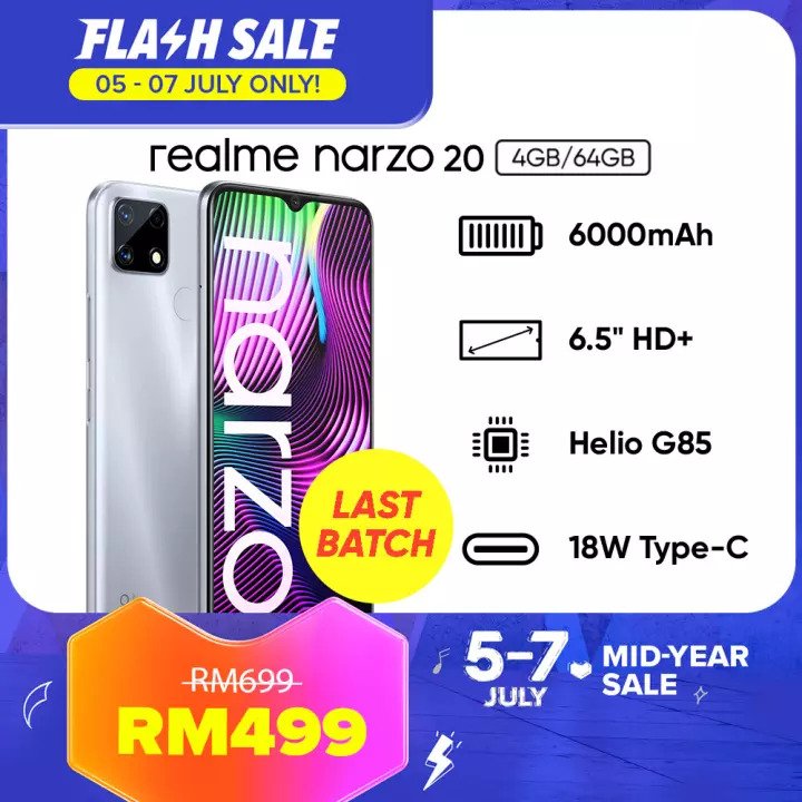 ▪ realme narzo 20 Smartphone (4GB RAM + 64GB ROM) – RM699 RM499【点击这里】