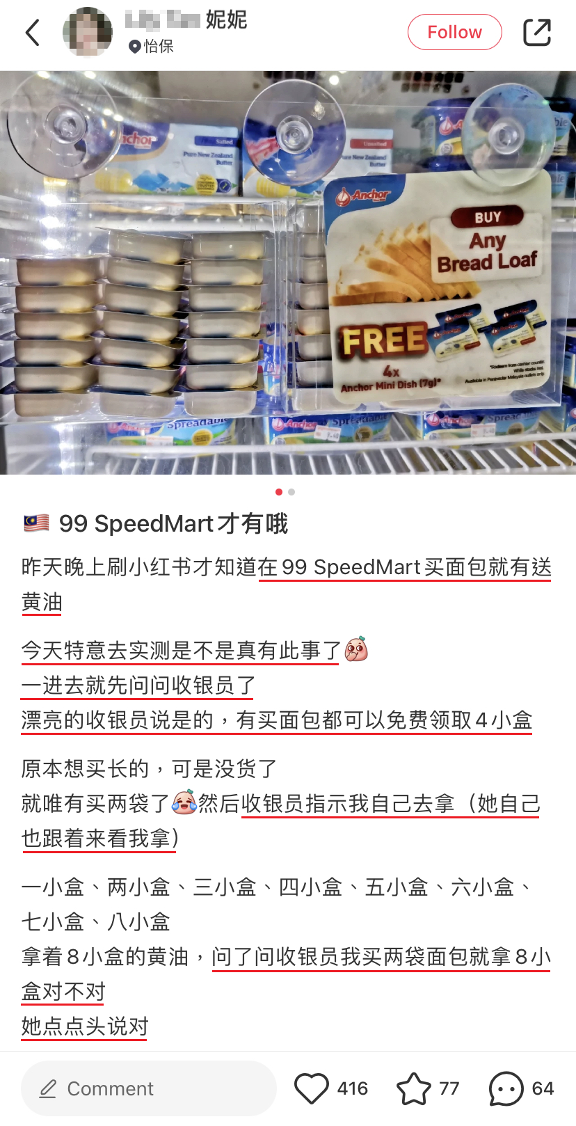 这两天越来越多网友在小红书分享才知道,原来 99 Speedmart 静悄悄地推出了特别优惠,只要买1条面包就可以免费获得4小盒的牛油!