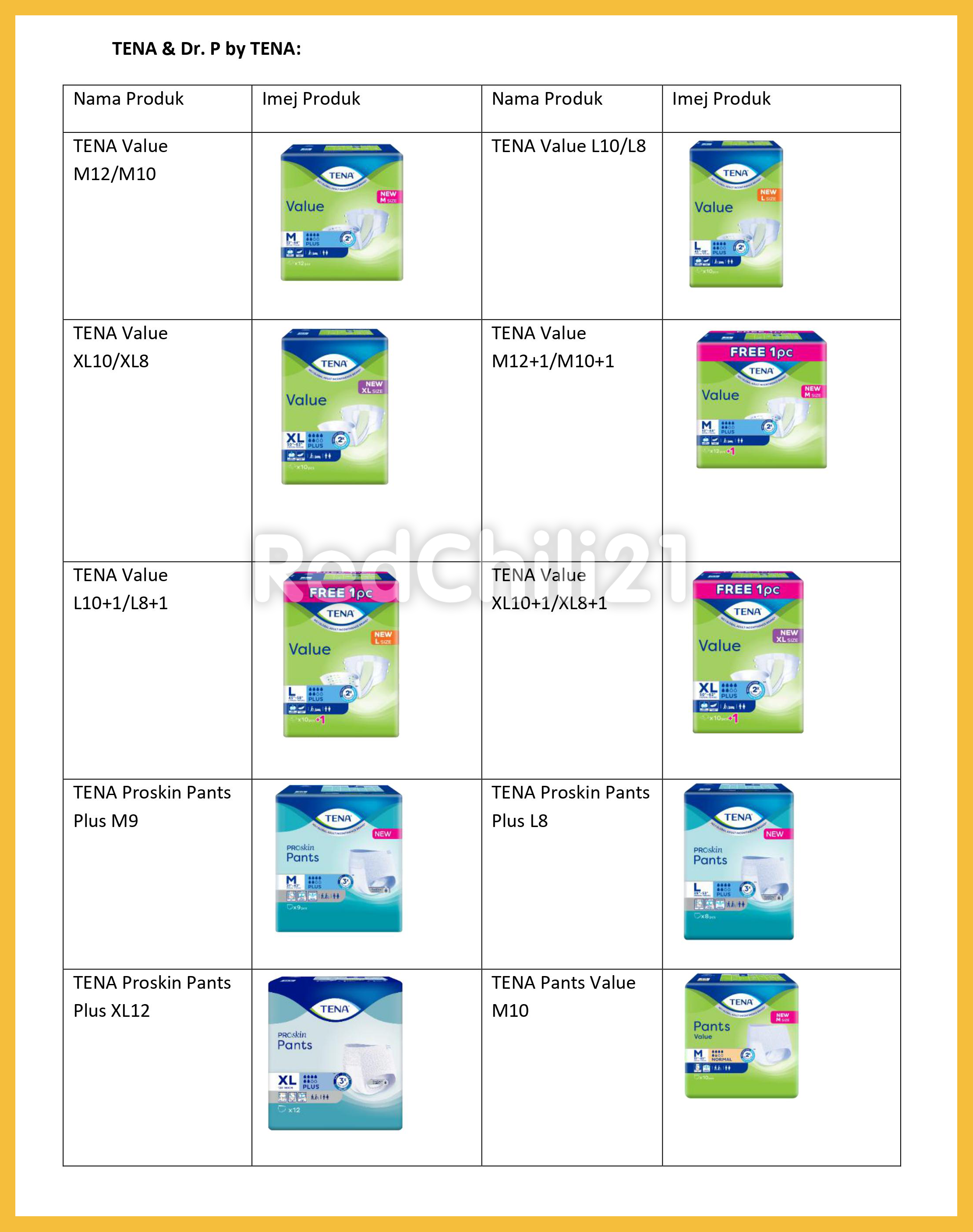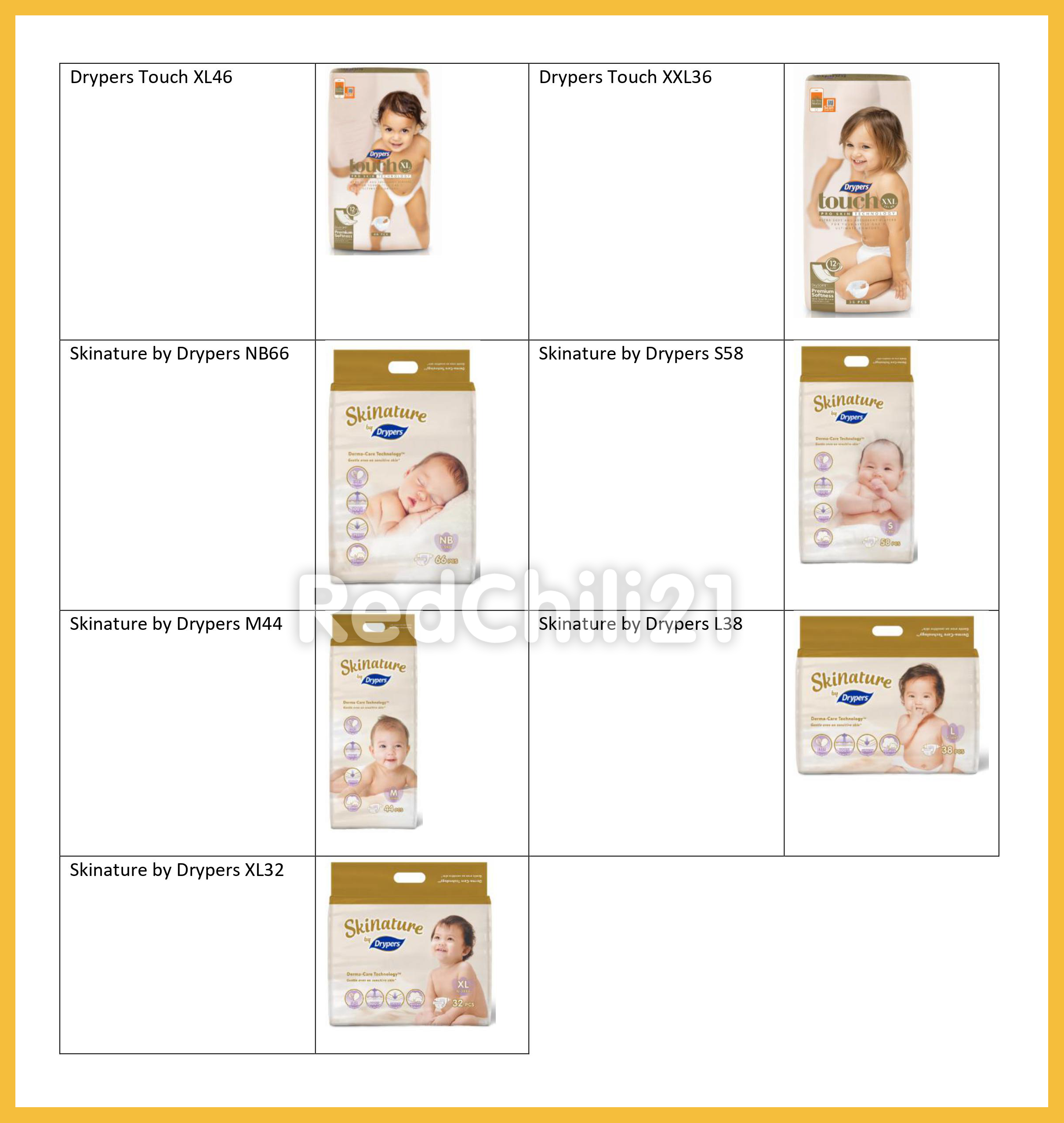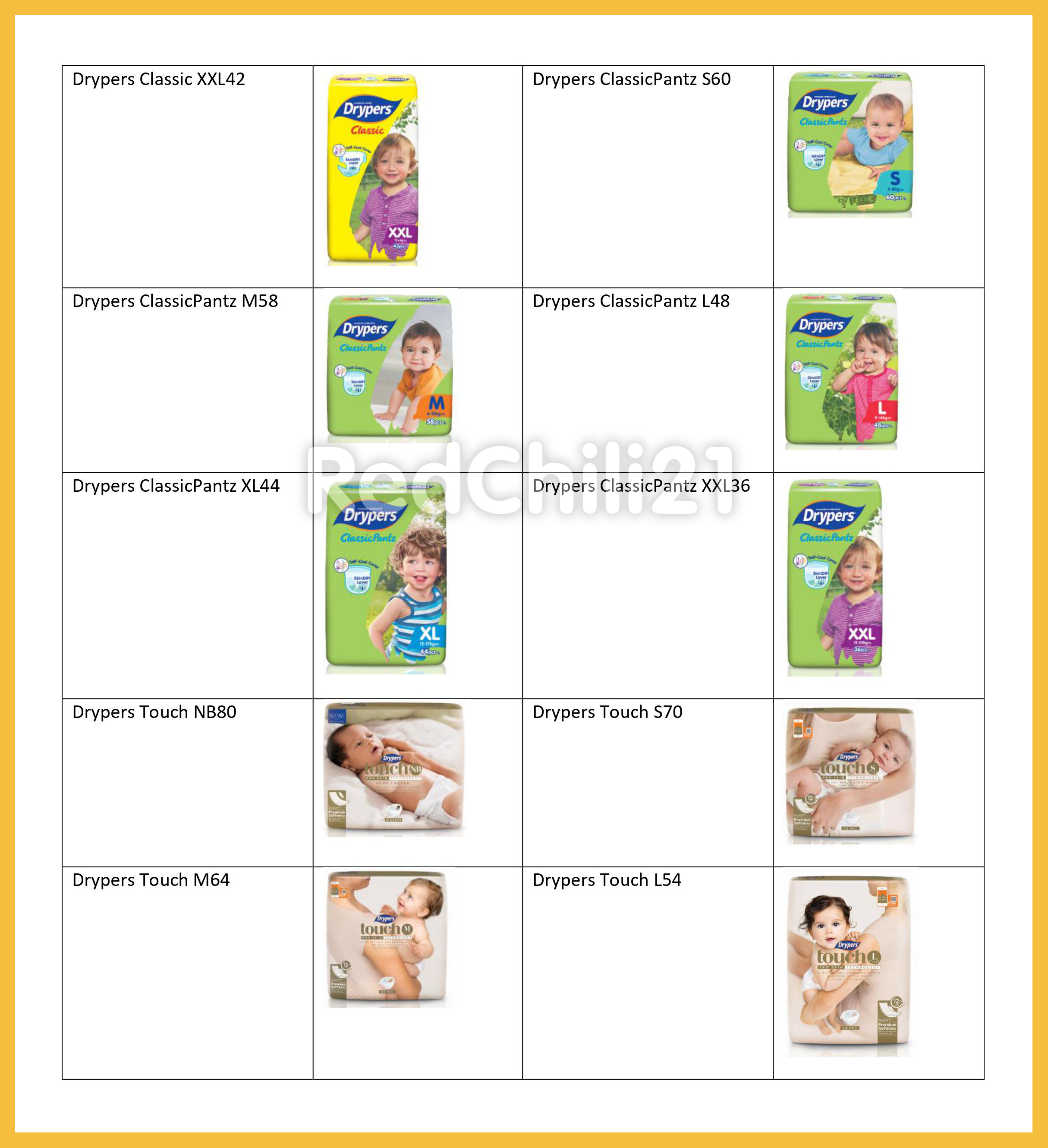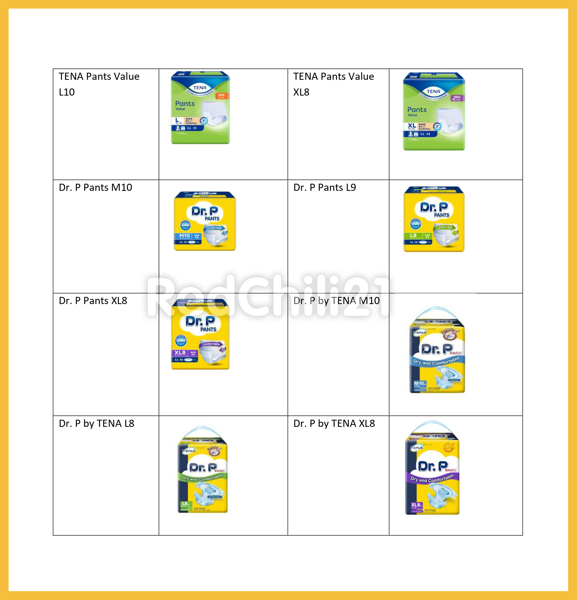 ▼ 以下是可兑换的Drypers、Tena 和Dr.P 款式包装袋子列表: