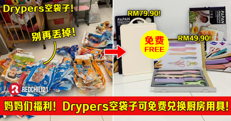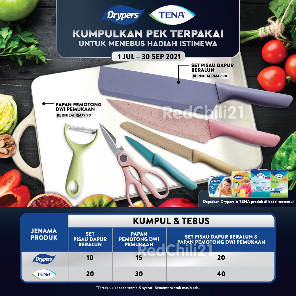 是不是很棒呢?!如果你一直都有收集Drypers 或Tena 纸尿片的袋子,就可免费兑换一套刀具和砧板!