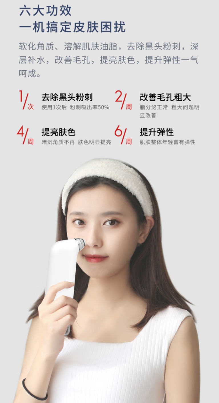 此外,DOCO黑头仪具有6大功效,分别是软化角质、溶解肌肤油脂、去除黑头粉刺、深层补水、改善毛孔、提升肤色。